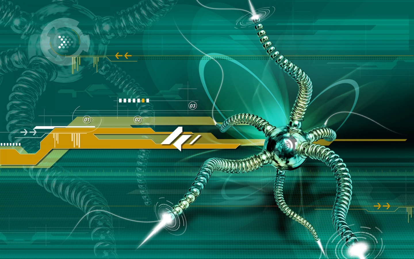 Description: A computer generated image of a green spider with a yellow arrow pointing to it's right side and a yellow arrow pointing to the left.