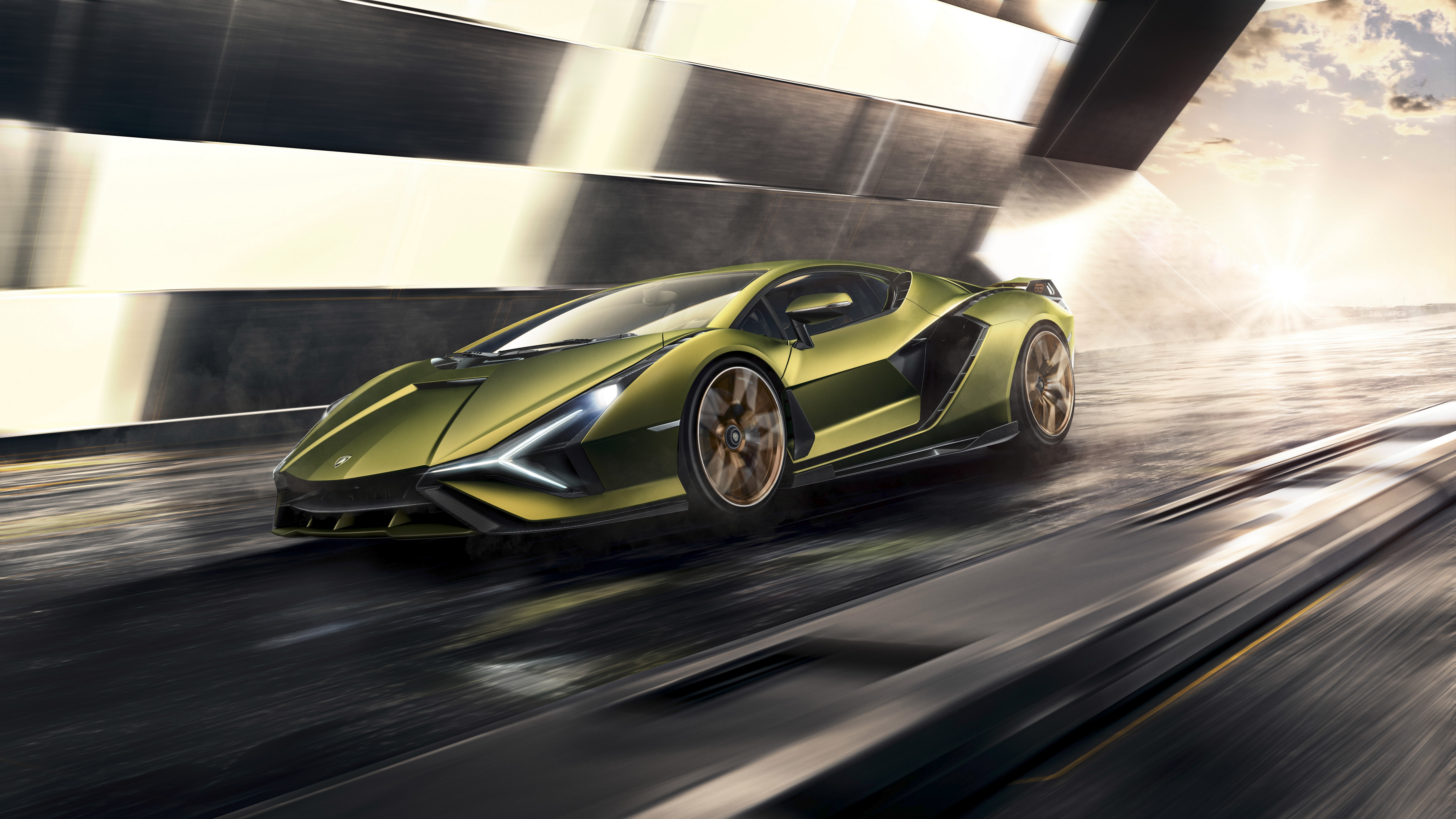 Description: A green sports car driving down a city street in front of a building with a sky background and a sun shining on the top.