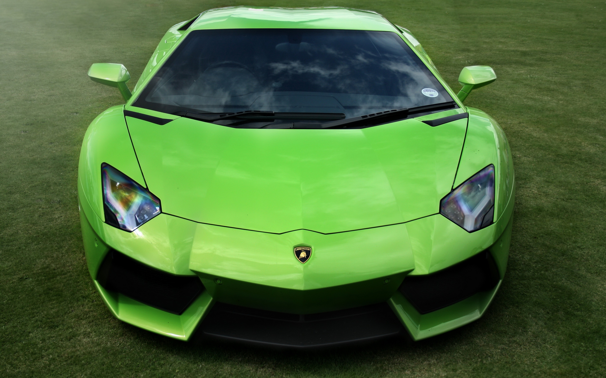 Description: A green sports car parked on a grass field with a cloudy sky in the background and a few clouds in the back.