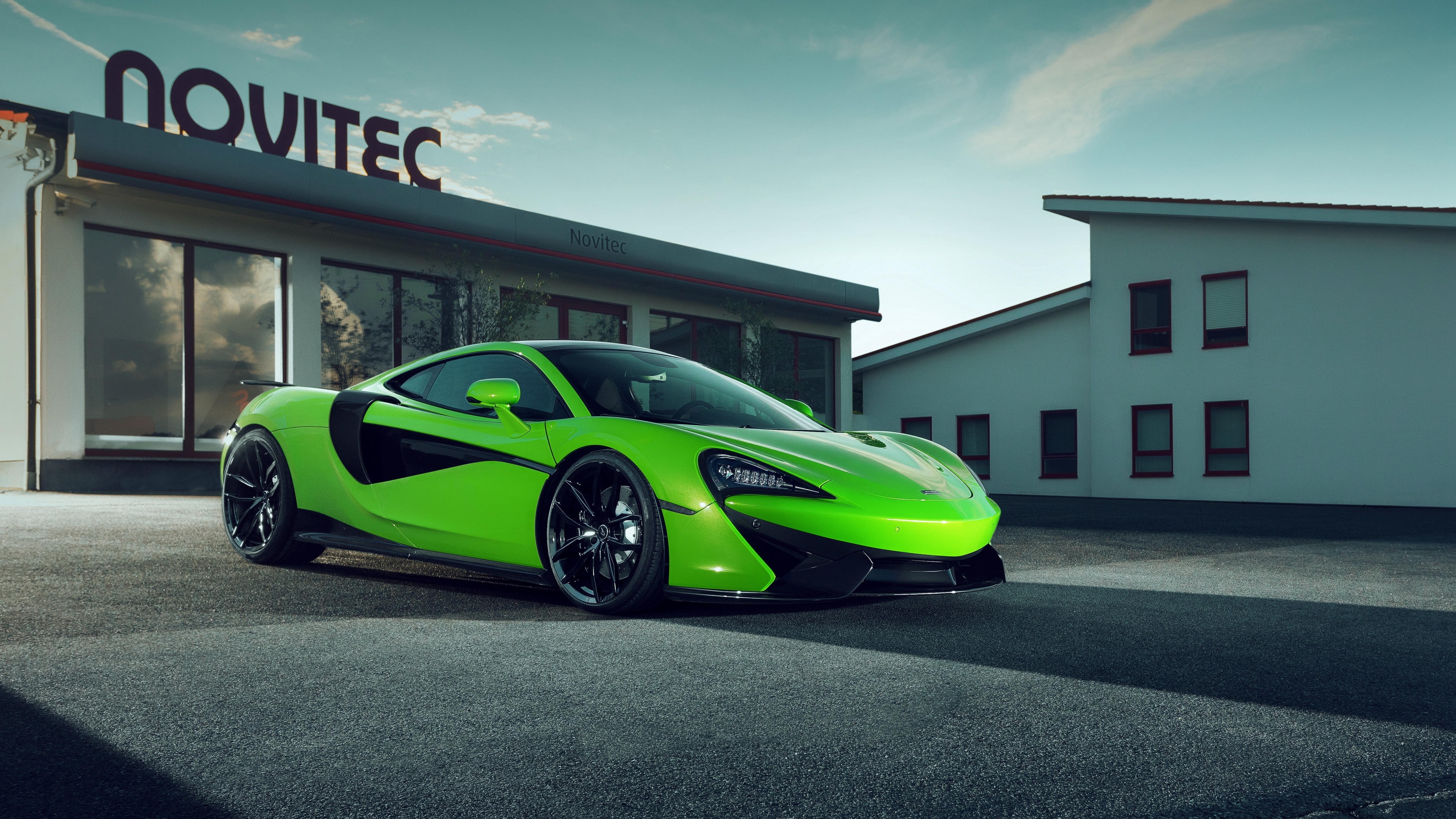 Description: A green sports car parked in front of a building with a sign on it's side that says movitec.