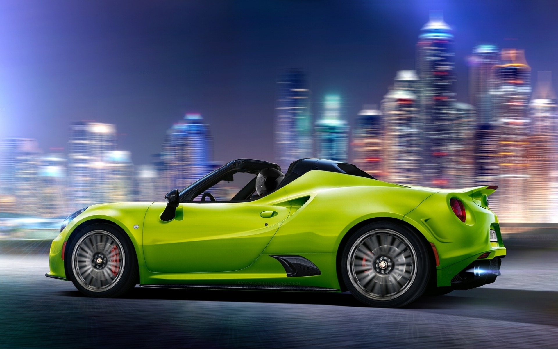 Description: A green sports car driving down a city street at night with a city skyline in the background and a bright light.