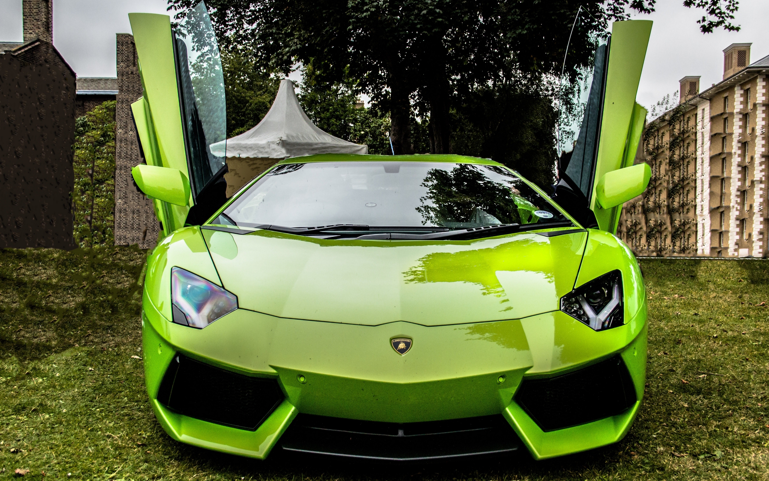 Description: A green sports car parked in a grassy area with its doors open and the hood open and the door open.