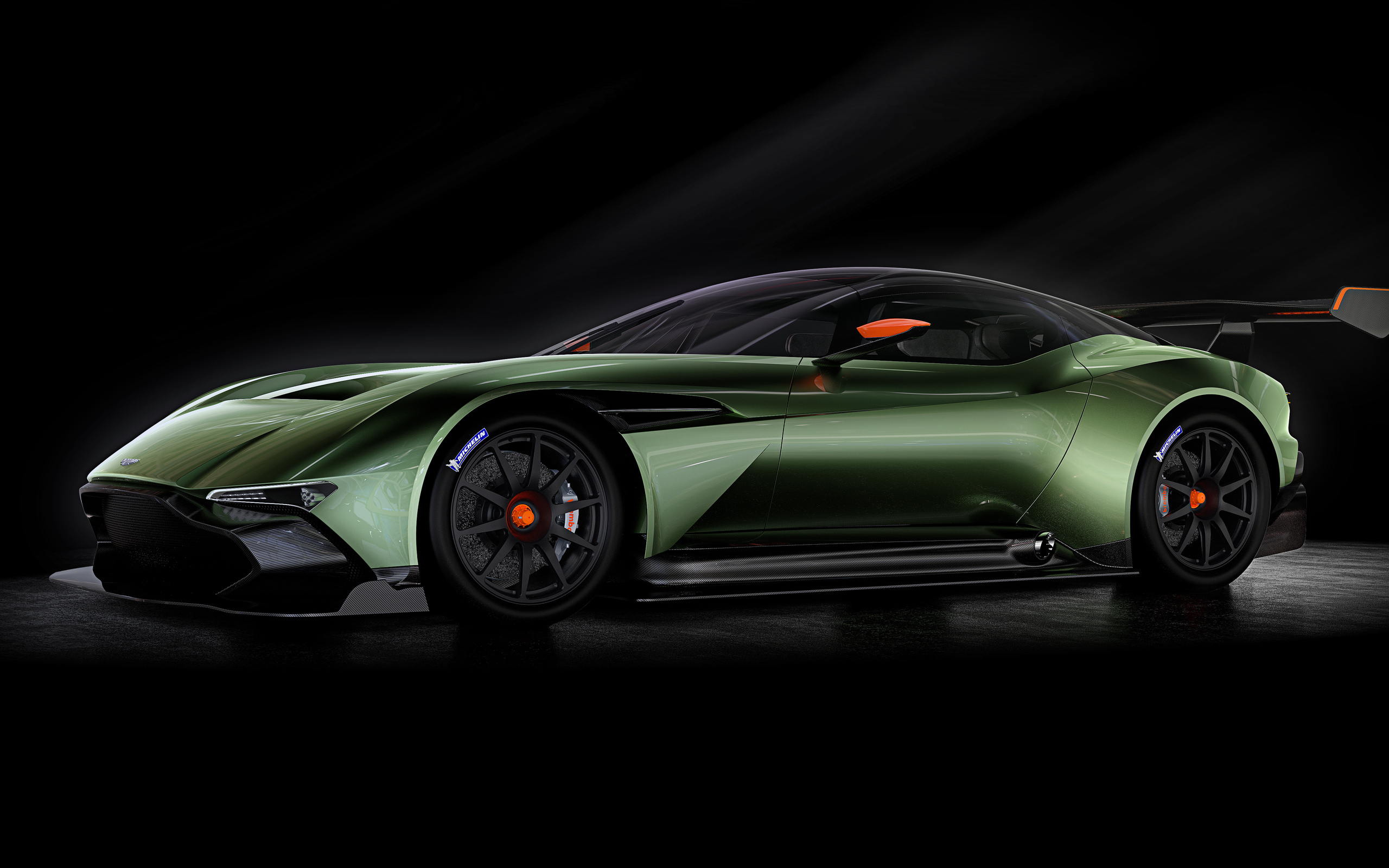 Description: A green sports car in a dark room with a spotlight on it's side and a black background.
