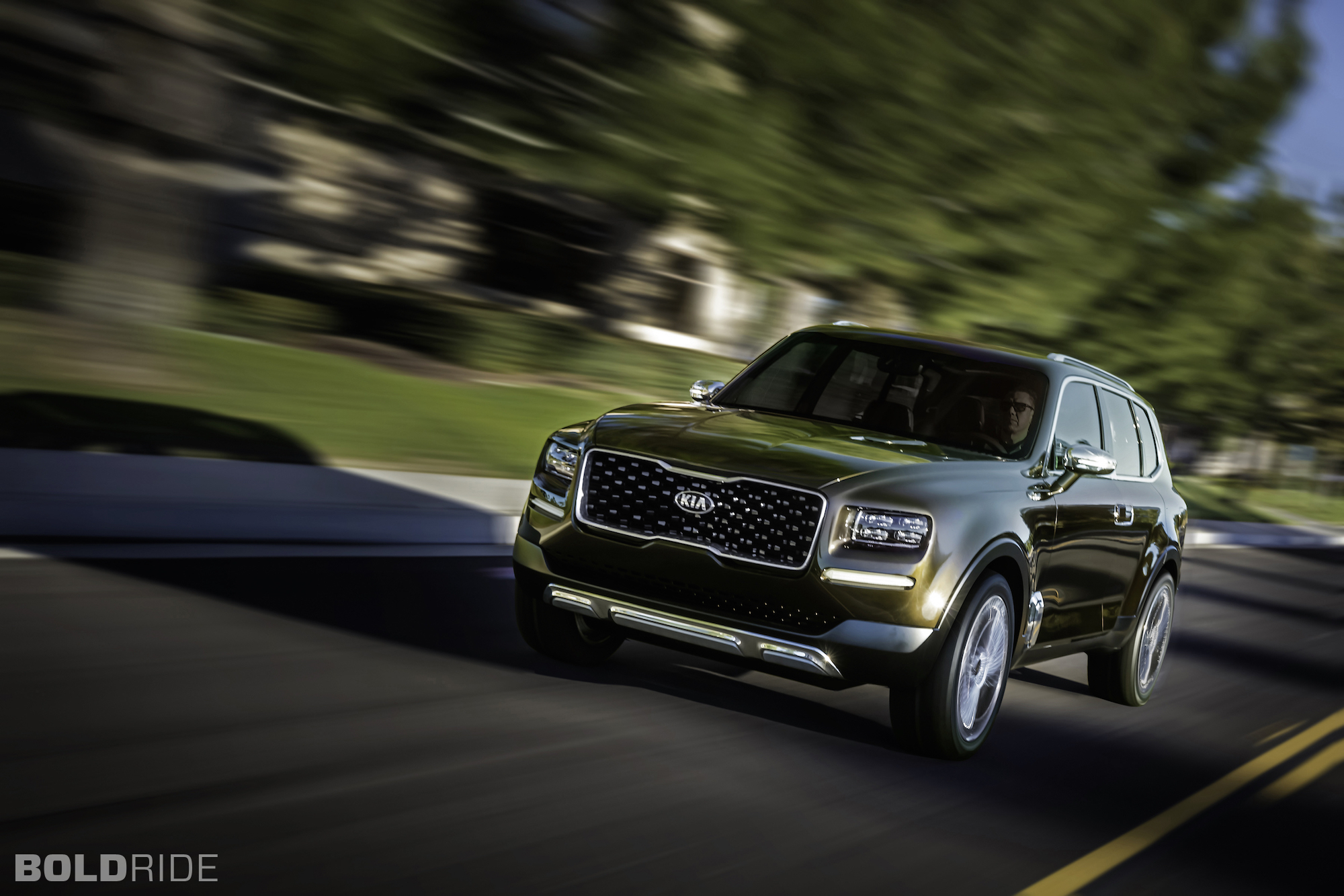 Description: A green suv driving down a street next to a lush green forest of trees and bushes on a sunny day.