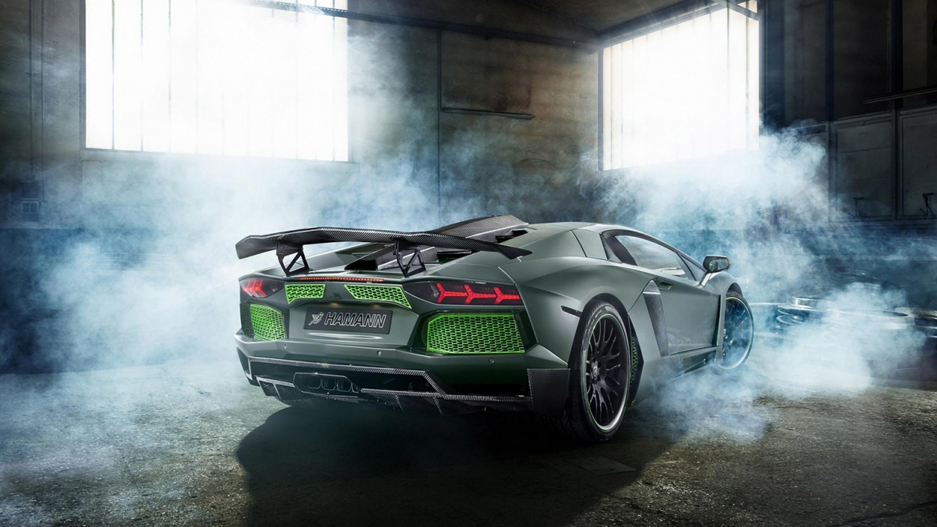 Description: A car with a green tailpipe and a black hood in a garage with smoke coming out of it.