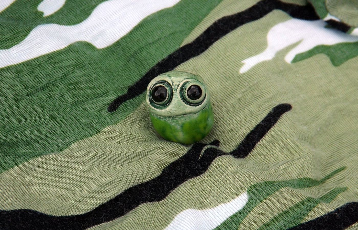 Description: A green toy with eyes and a camouflage shirt on it's side.