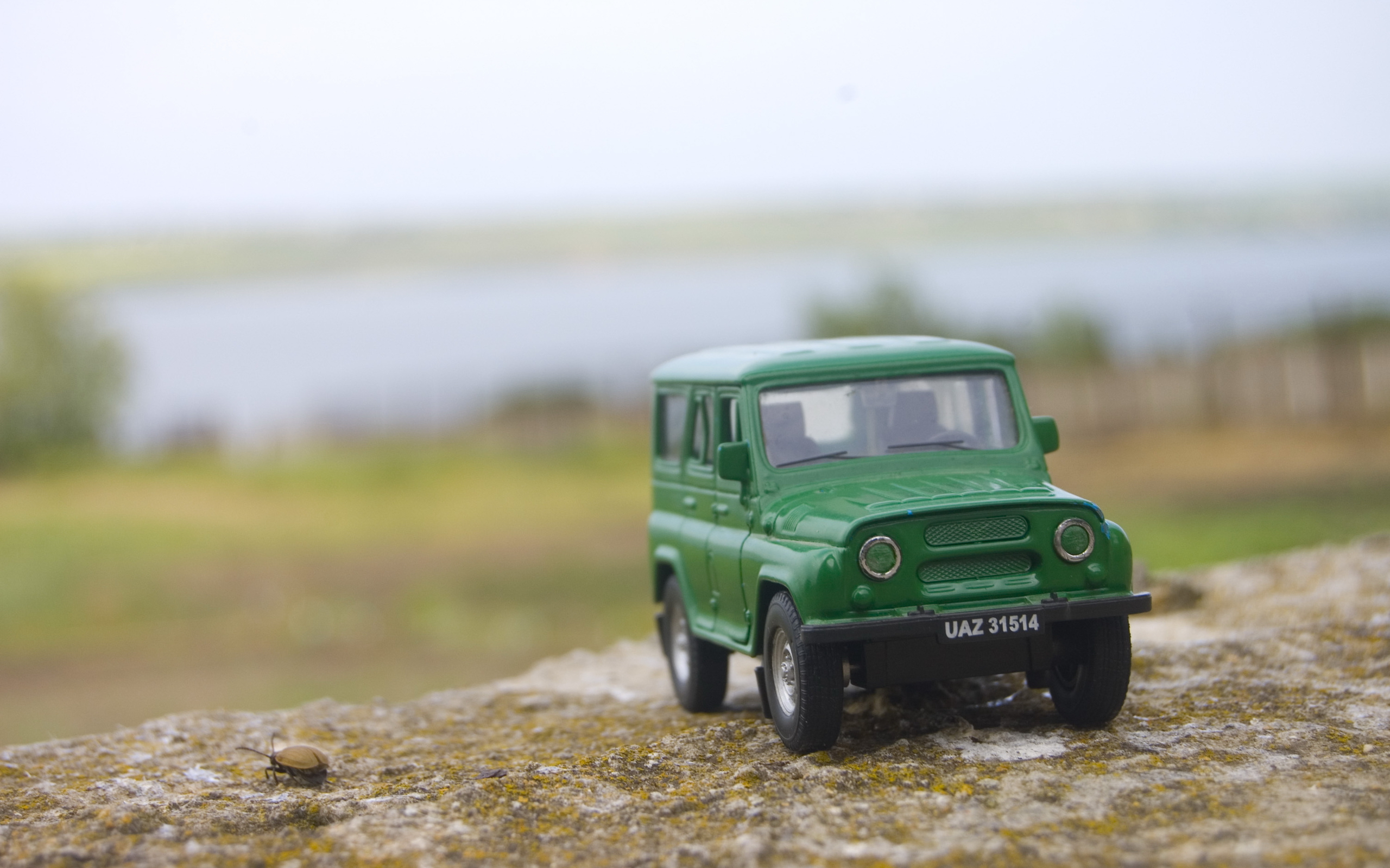 Description: A green toy truck is parked on a rock near a body of water and a grassy area with trees.