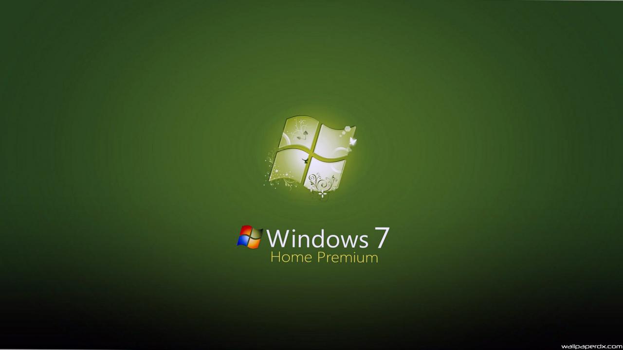 Description: A green wallpaper with a logo for windows 7 home premium on it's side and a window 7 logo on the side.
