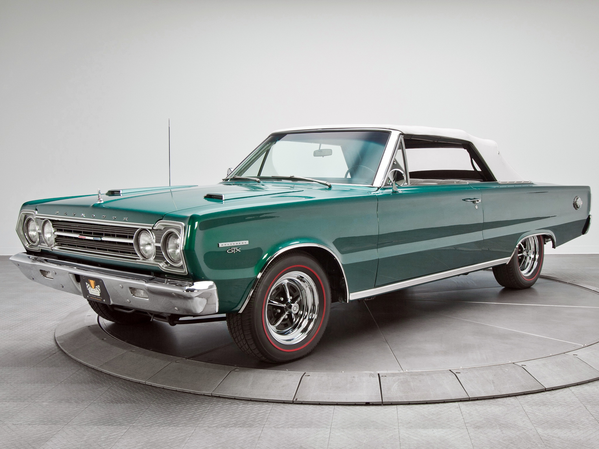 Description: A green and white car on a circular surface in a room with a white wall and a black and white floor.