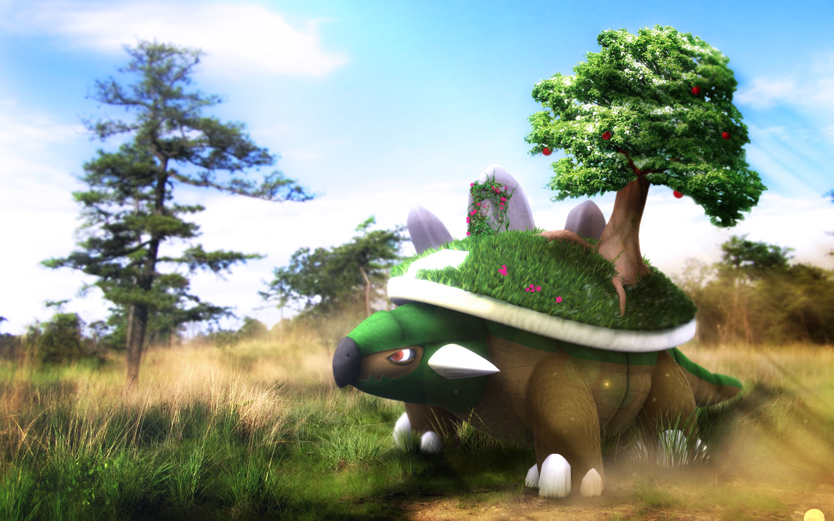 Description: A green and white dinosaur with a tree on its back in a field of grass and trees with a blue sky in the background.