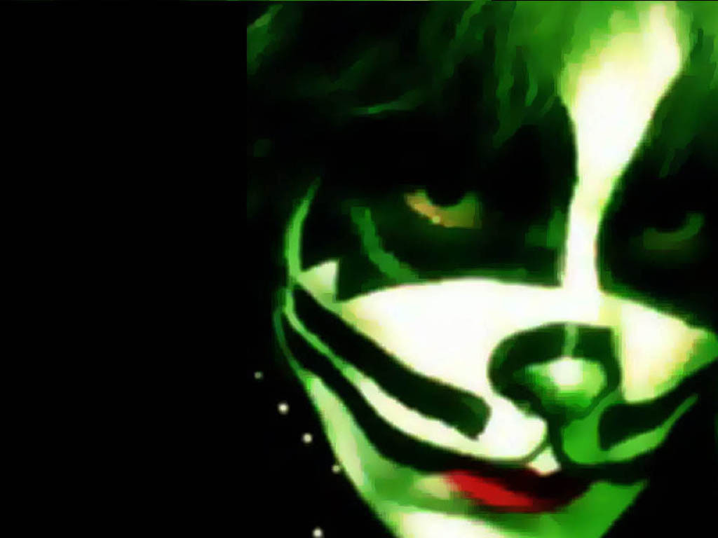 Description: A person with a green and white face paint on their face and a black background with a white and green mask.
