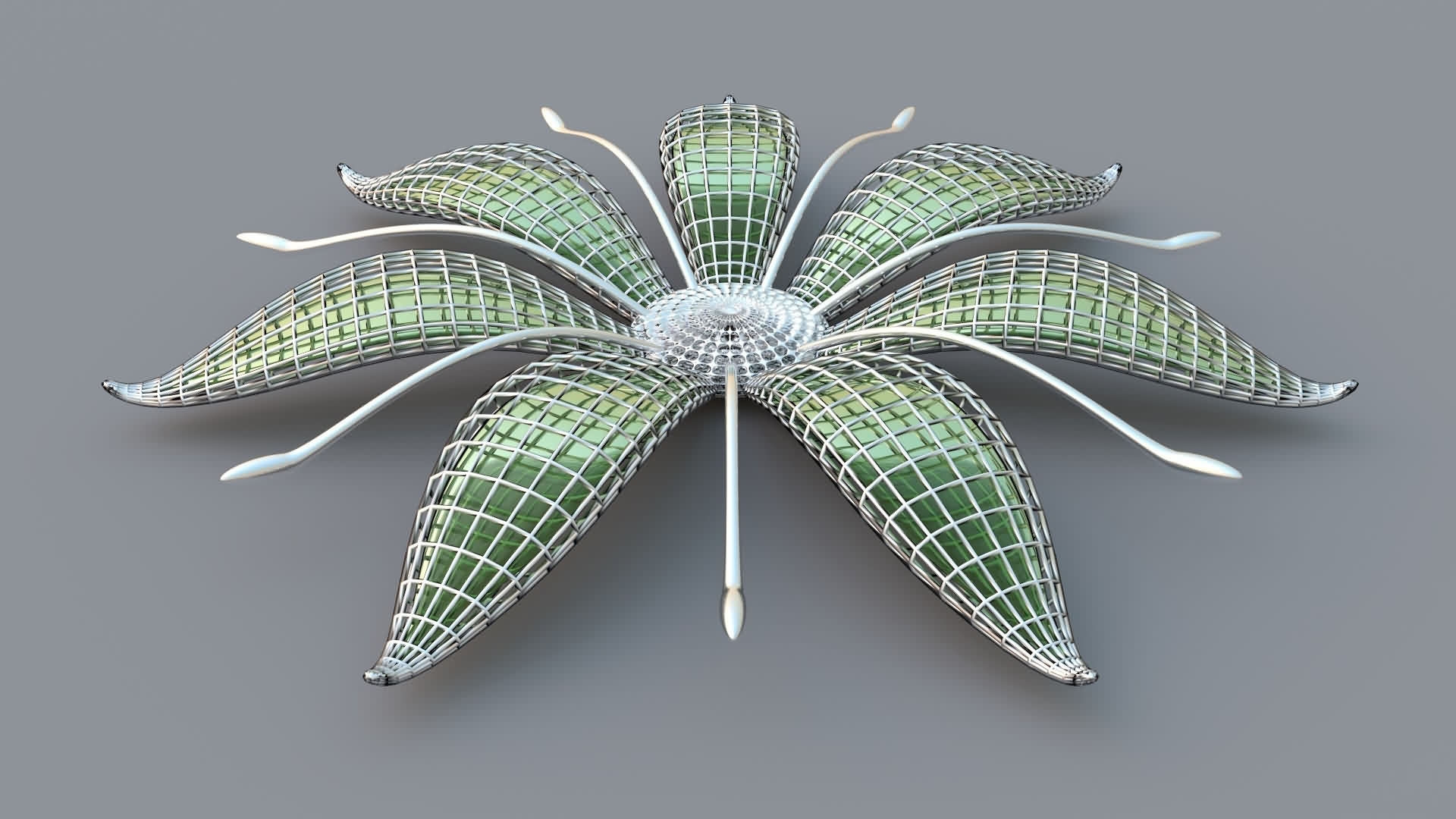 Description: A green and white flower with white stems and leaves on a gray background with a gray background and a gray background.