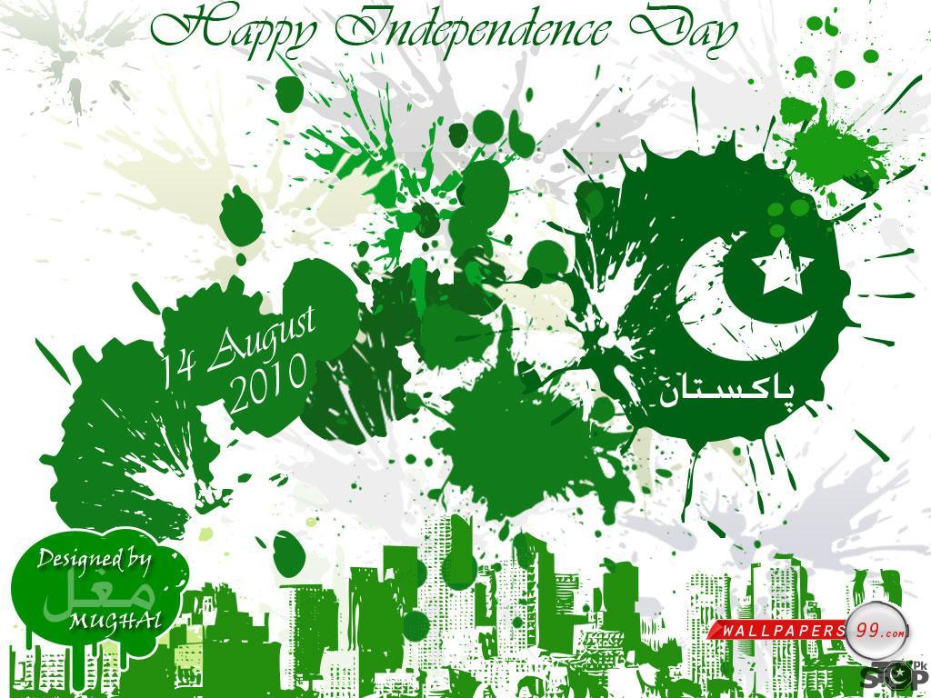 Description: A green and white poster with a city skyline in the background and a green and white banner with the words happy independence day.