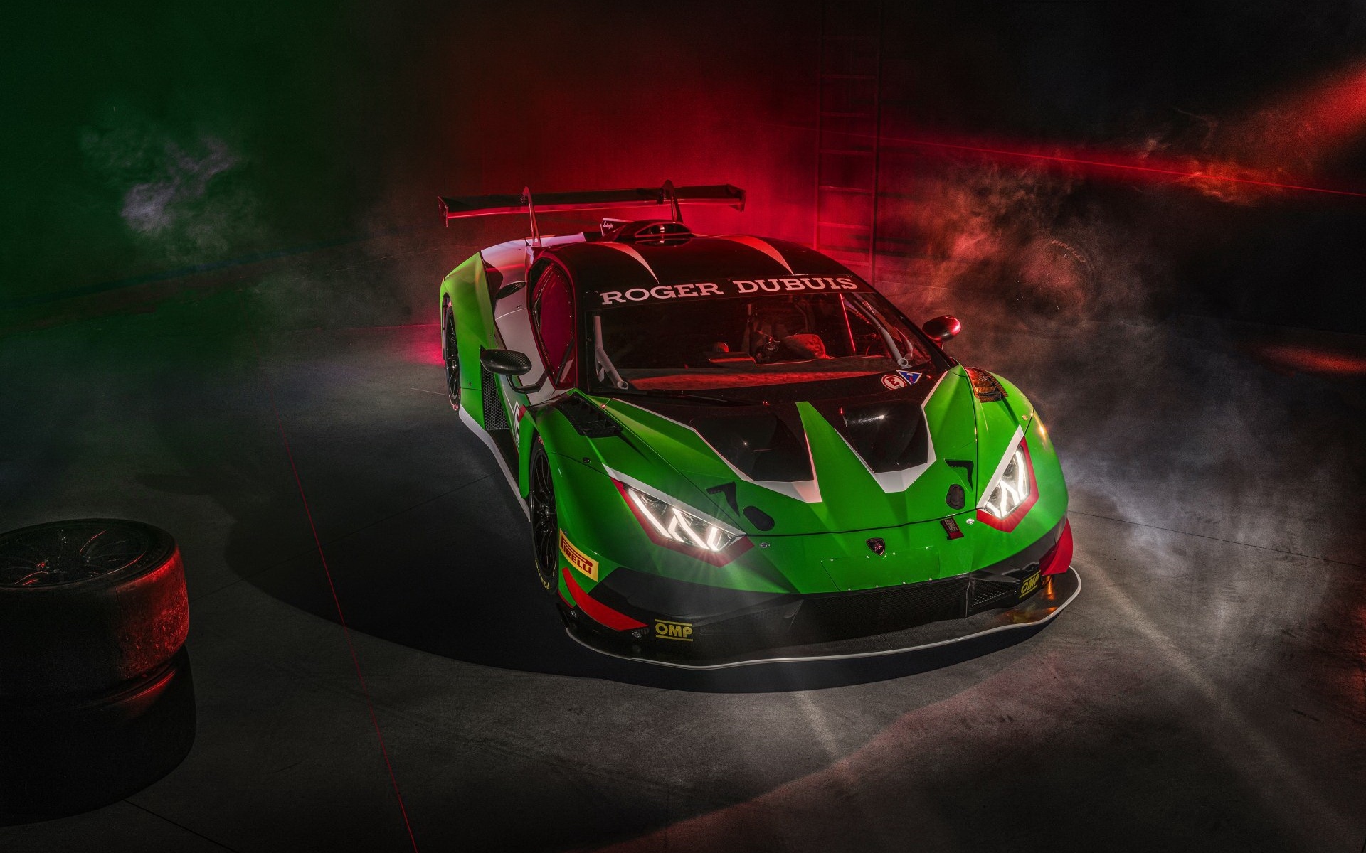 Description: A green and white sports car with smoke coming out of it's hood and the word rocket double on the side.