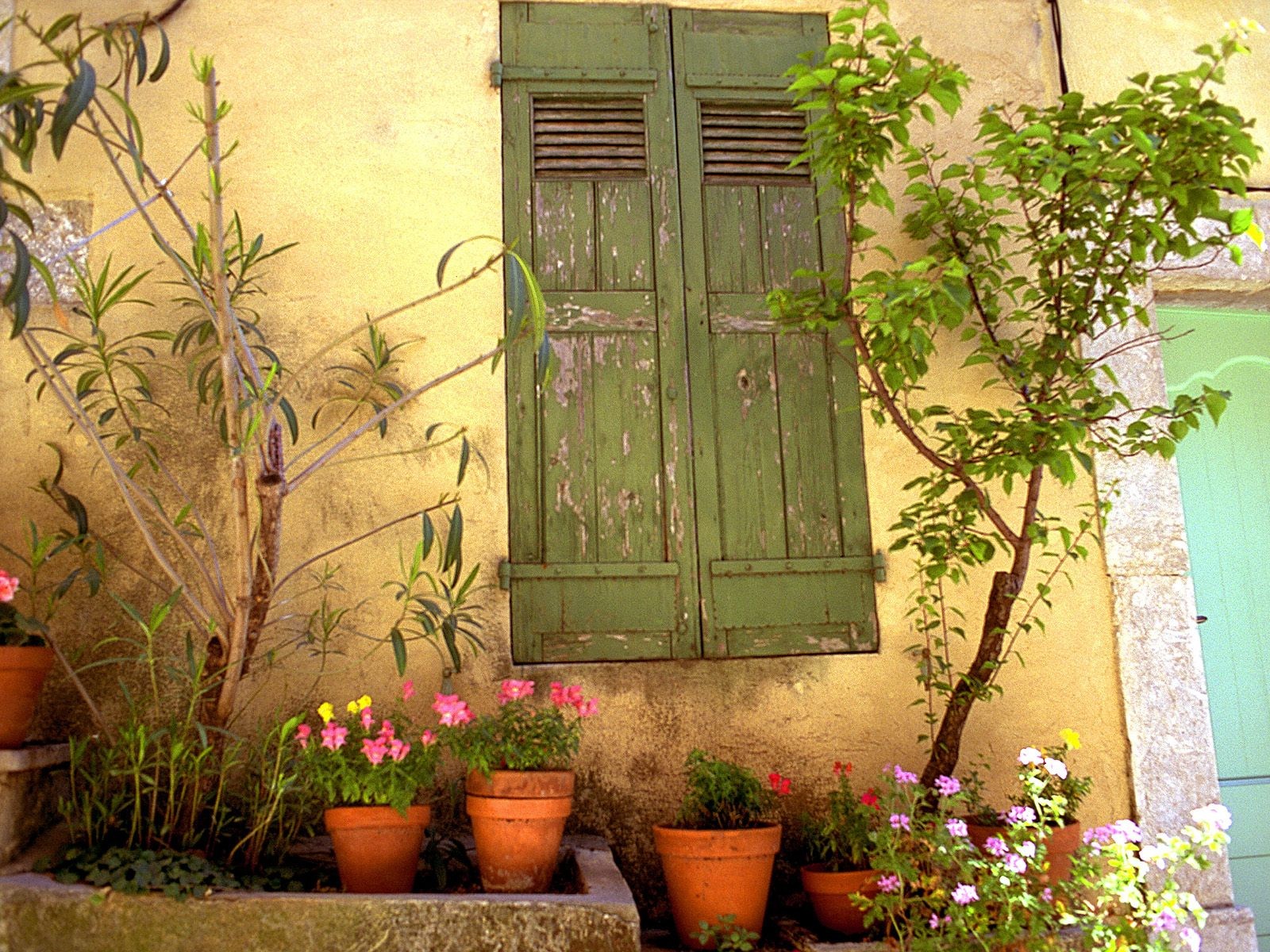 Description: A green window with a green shutter and a green door with a green shutter and a green door with a green window.