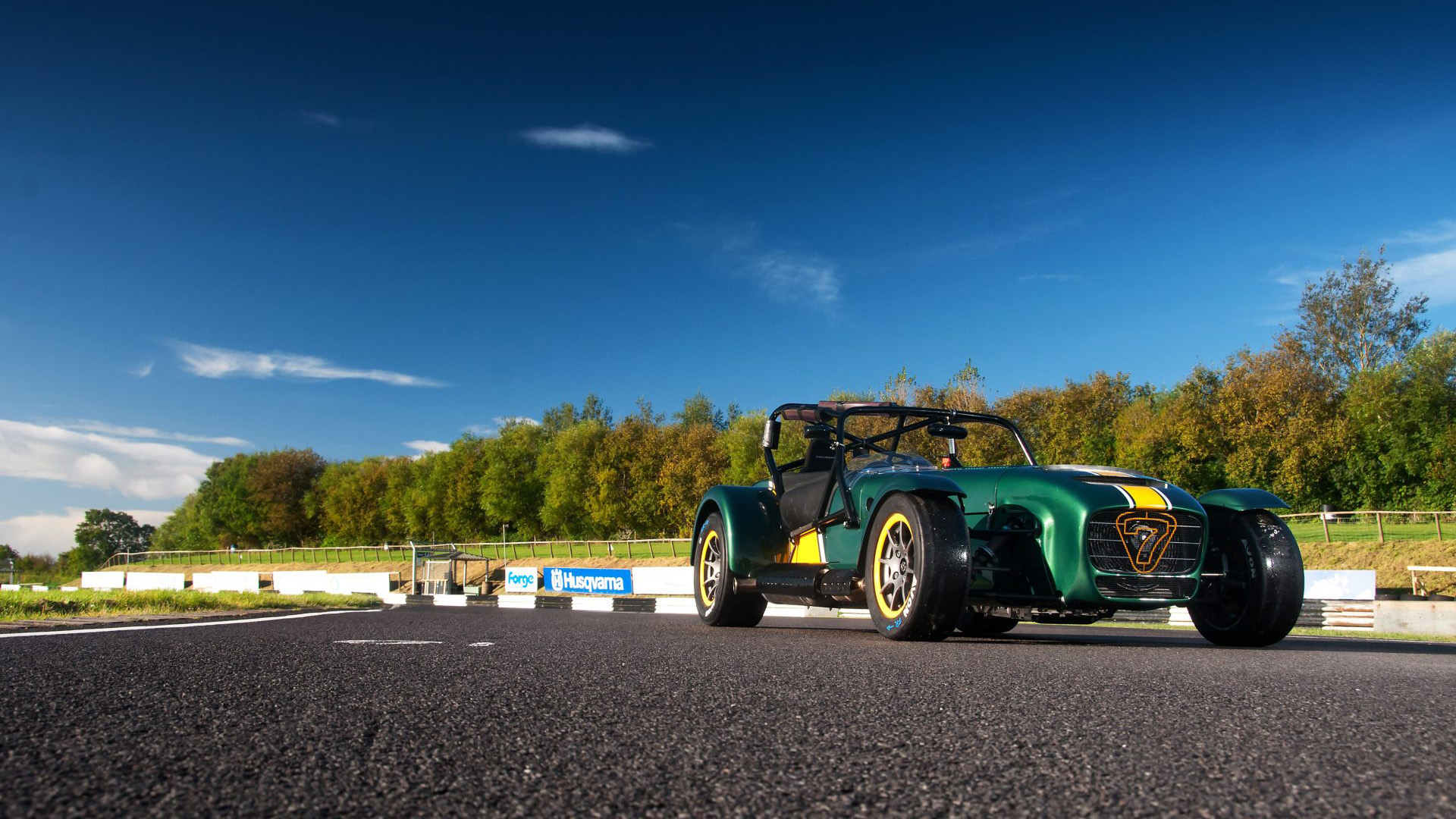 Description: A green and yellow car driving down a road next to a forest of trees and a fenced in area.