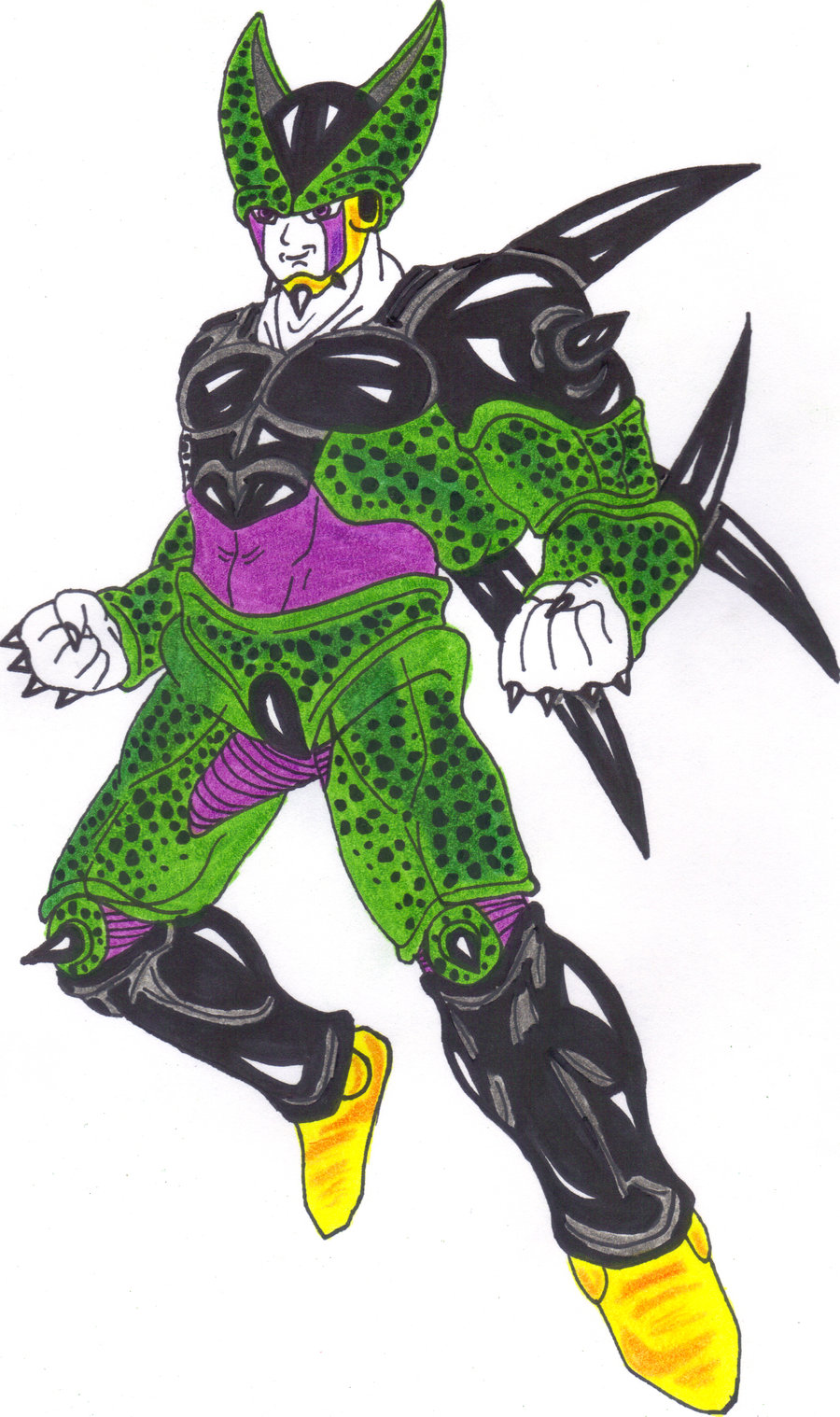 Description: A drawing of a green and yellow character with yellow feet and yellow shoes.