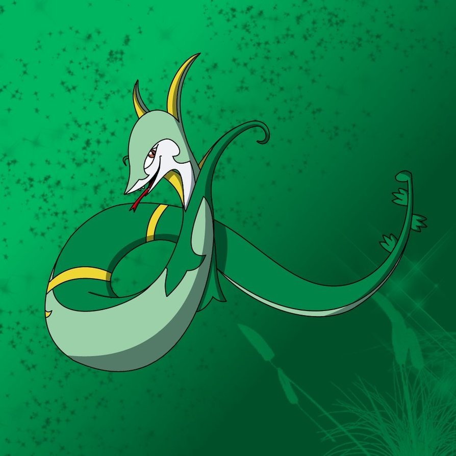 Description: A green and yellow dragon with a long tail and a white face on its head and tail.