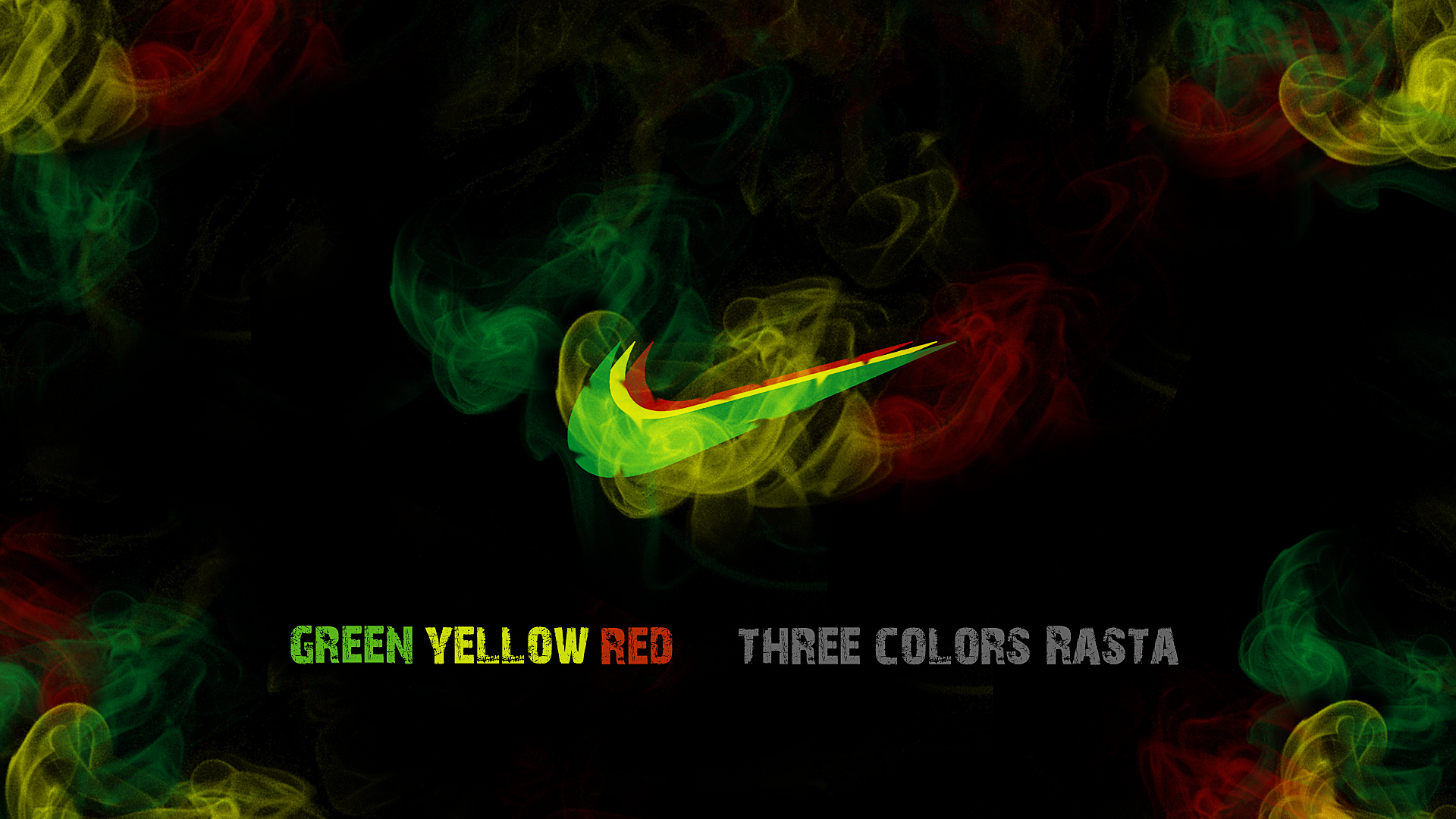 Description: A green and yellow nike logo on a black background with smoke around it and the words green yellow red three colors pasta.