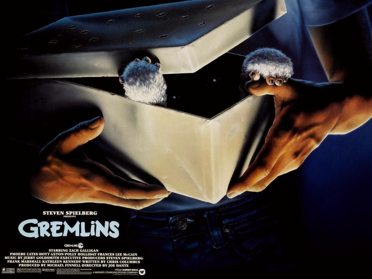 Description: A movie poster for the film gremlin's starring the cat in the box with the hands of a man.