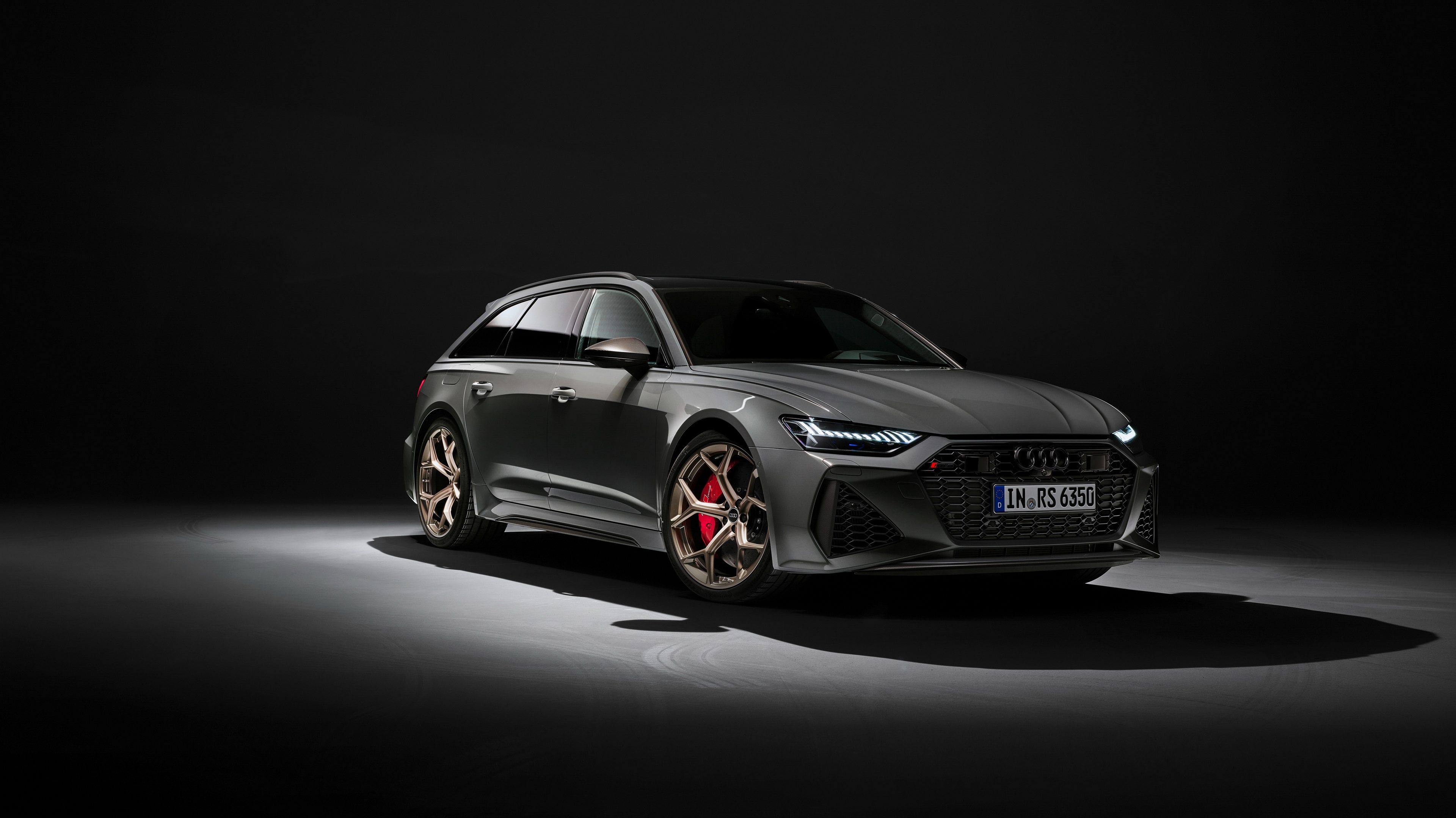 Description: A grey car is shown in a dark room with a black background and a spotlight on the floor and the front of the car.