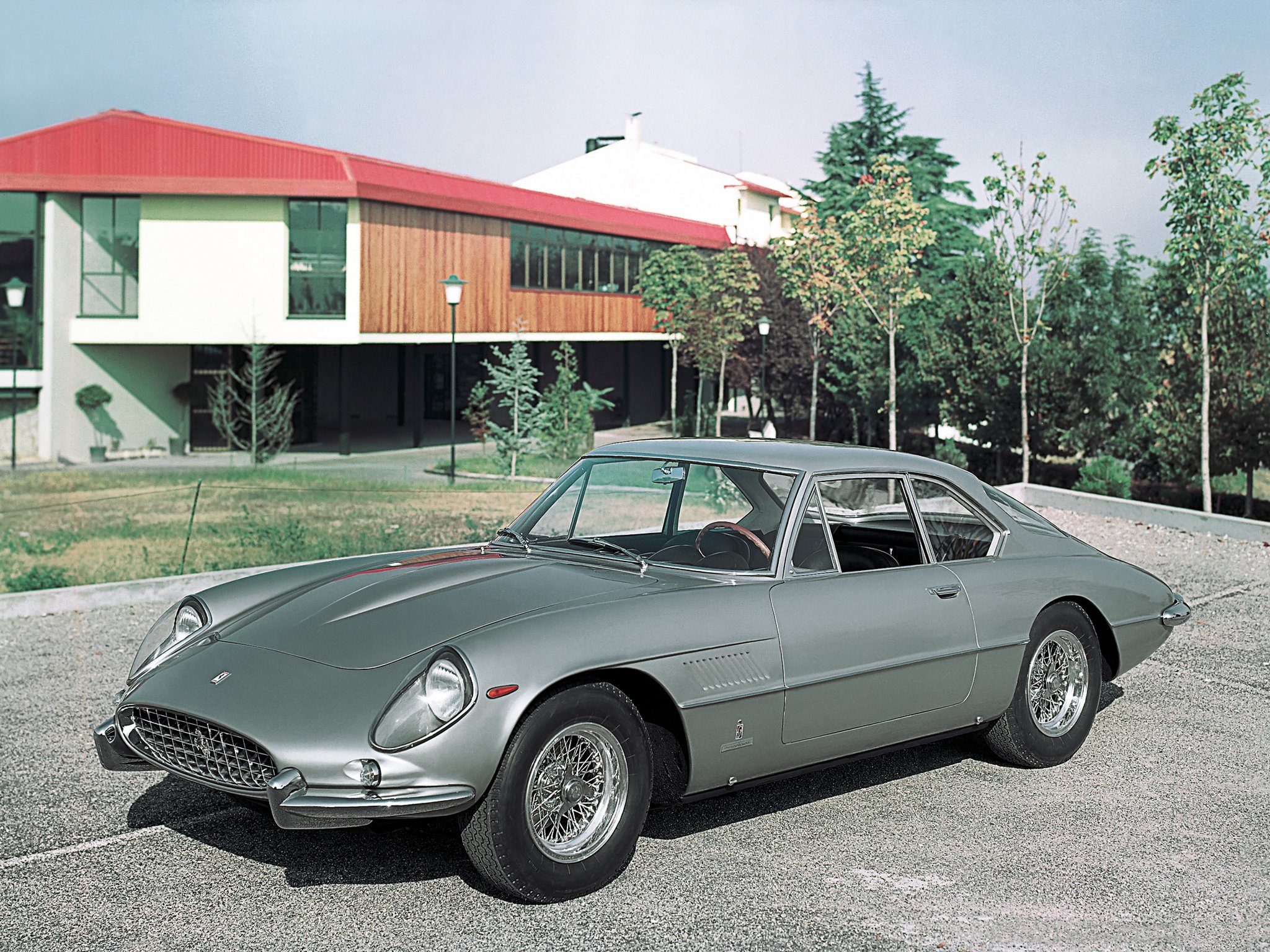 Description: A grey car parked in a parking lot next to a house and trees in the background with a red roof.