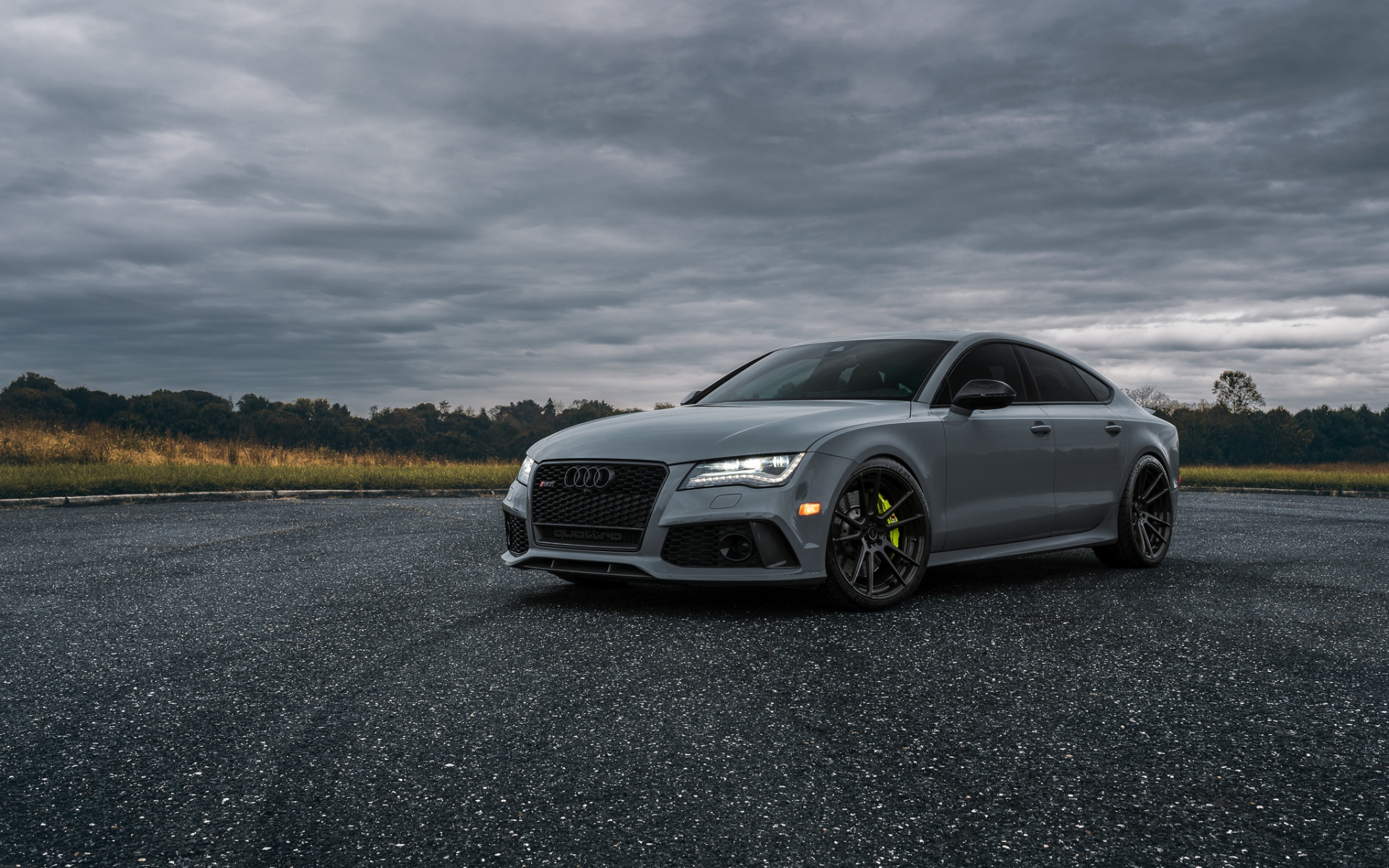 Description: A grey car parked on a paved road under a cloudy sky with trees in the background and a field of grass.