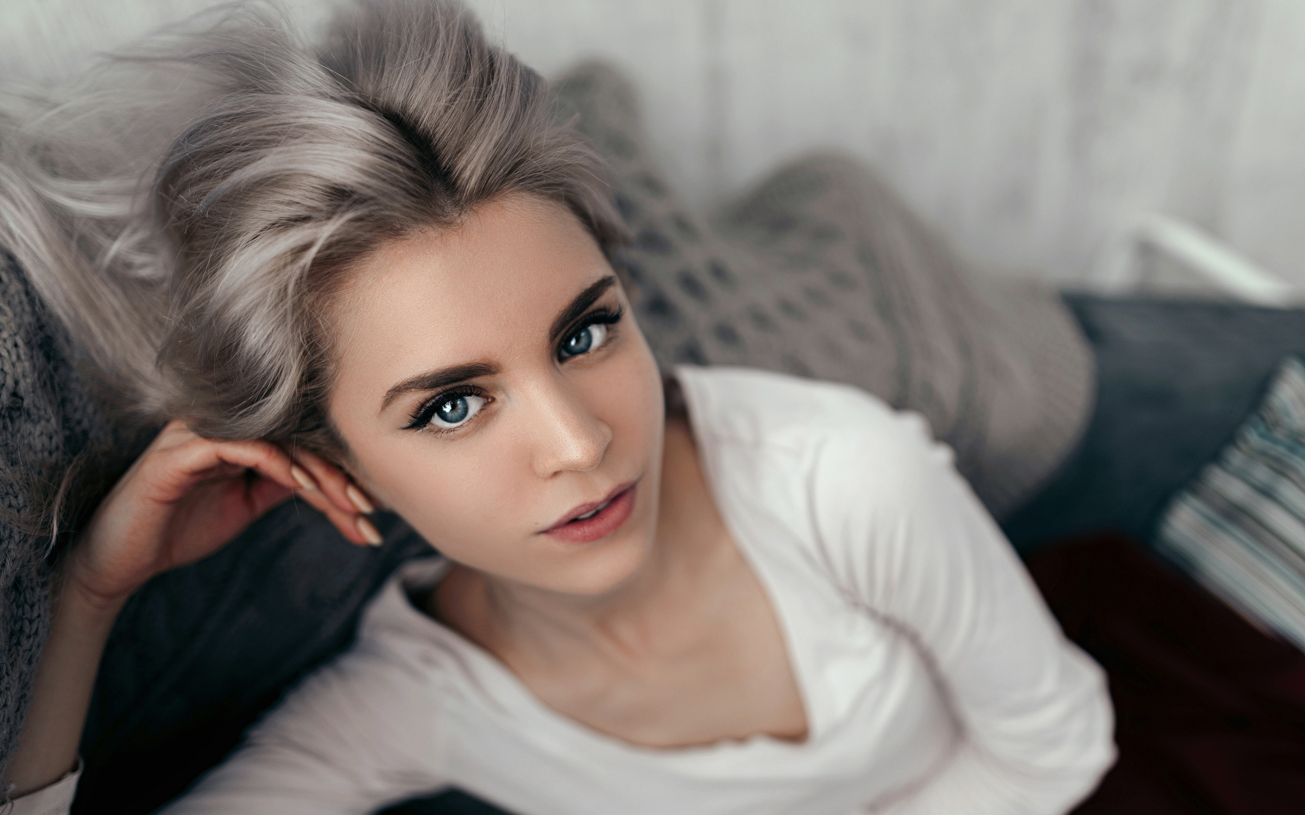 Description: A woman with grey hair and blue eyes posing for a picture with her hair in a bunt style.