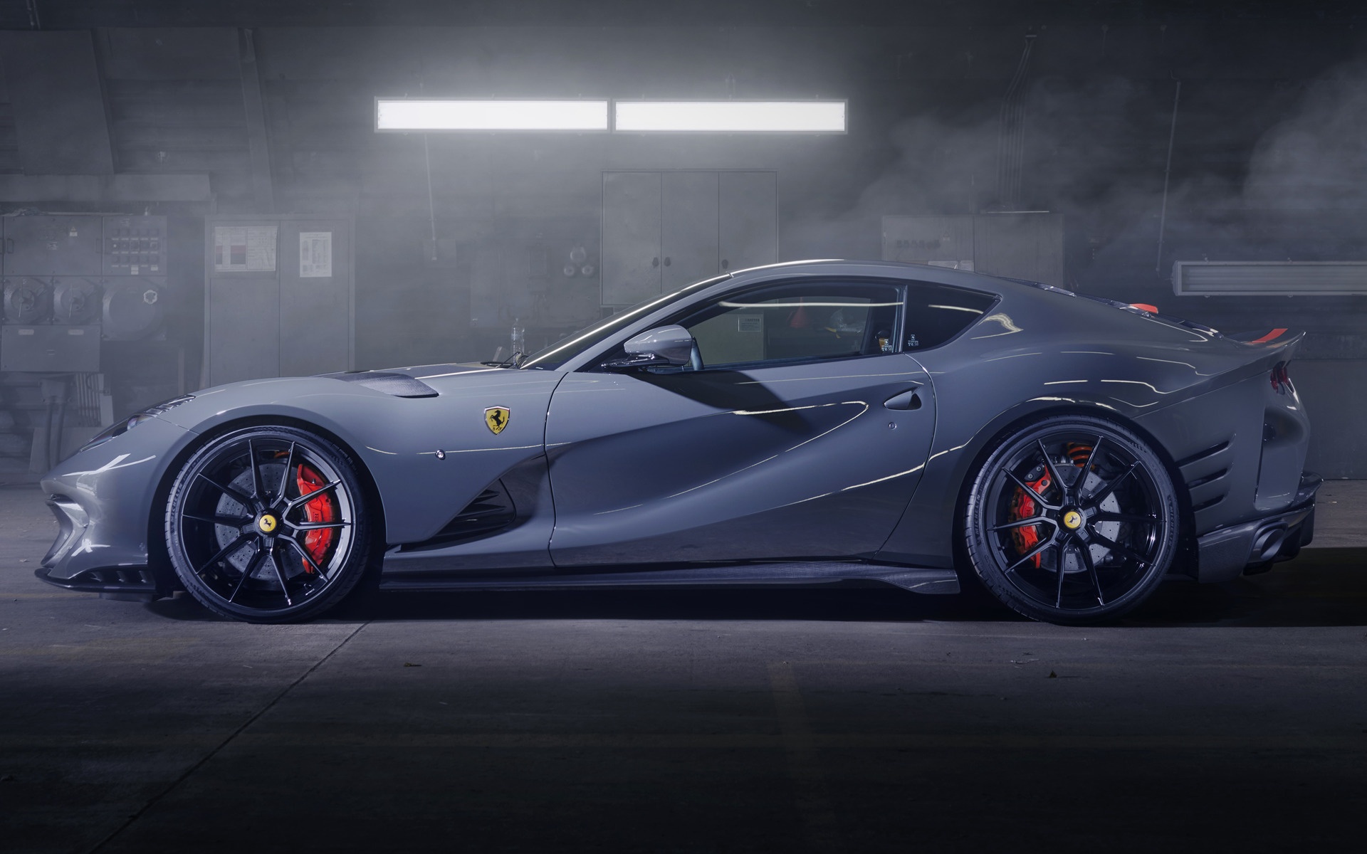 Description: A grey sports car in a dark garage with smoke coming out of the back of it's hood.