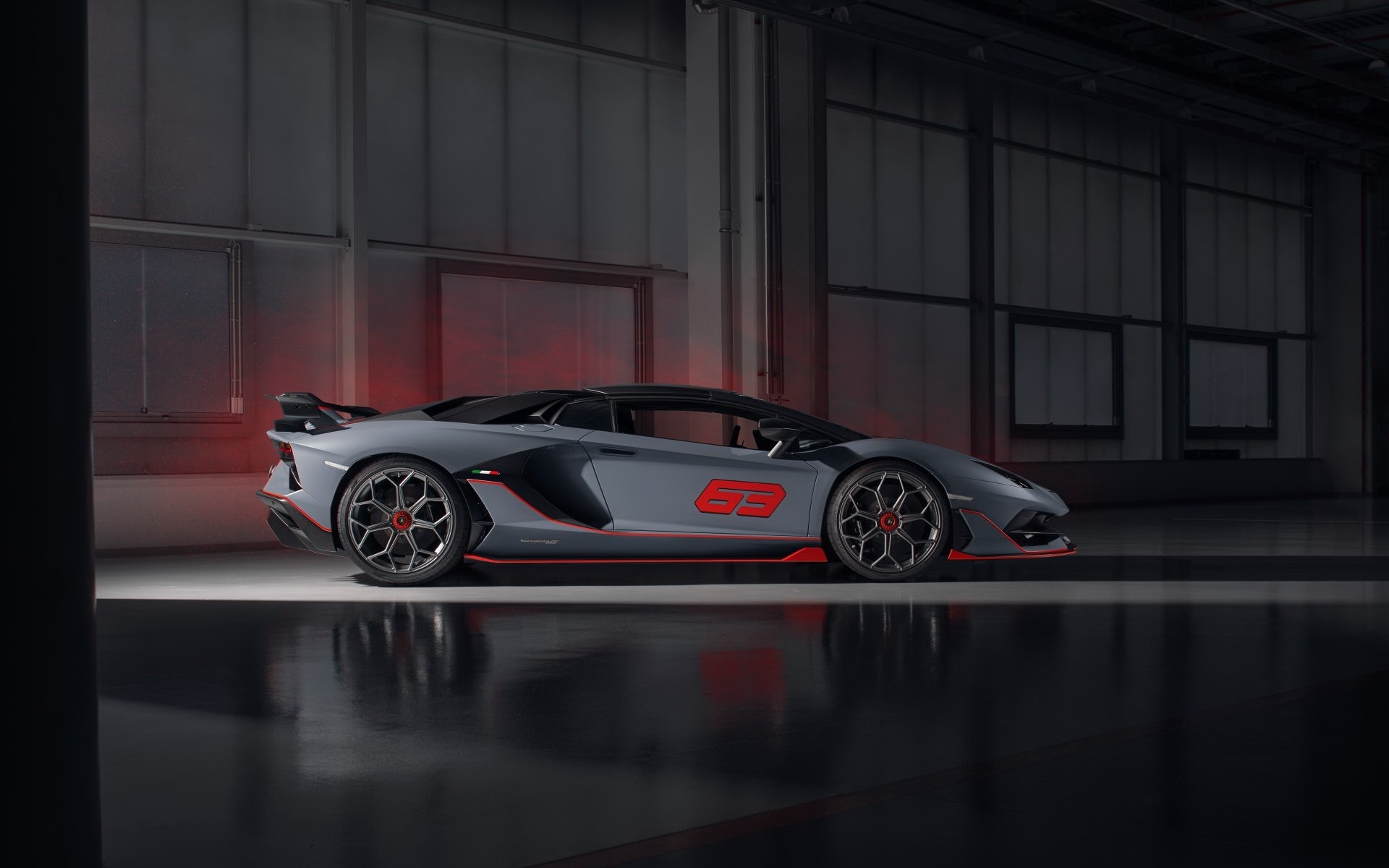 Description: A grey sports car parked in a garage with red lights on it's side and a black background.