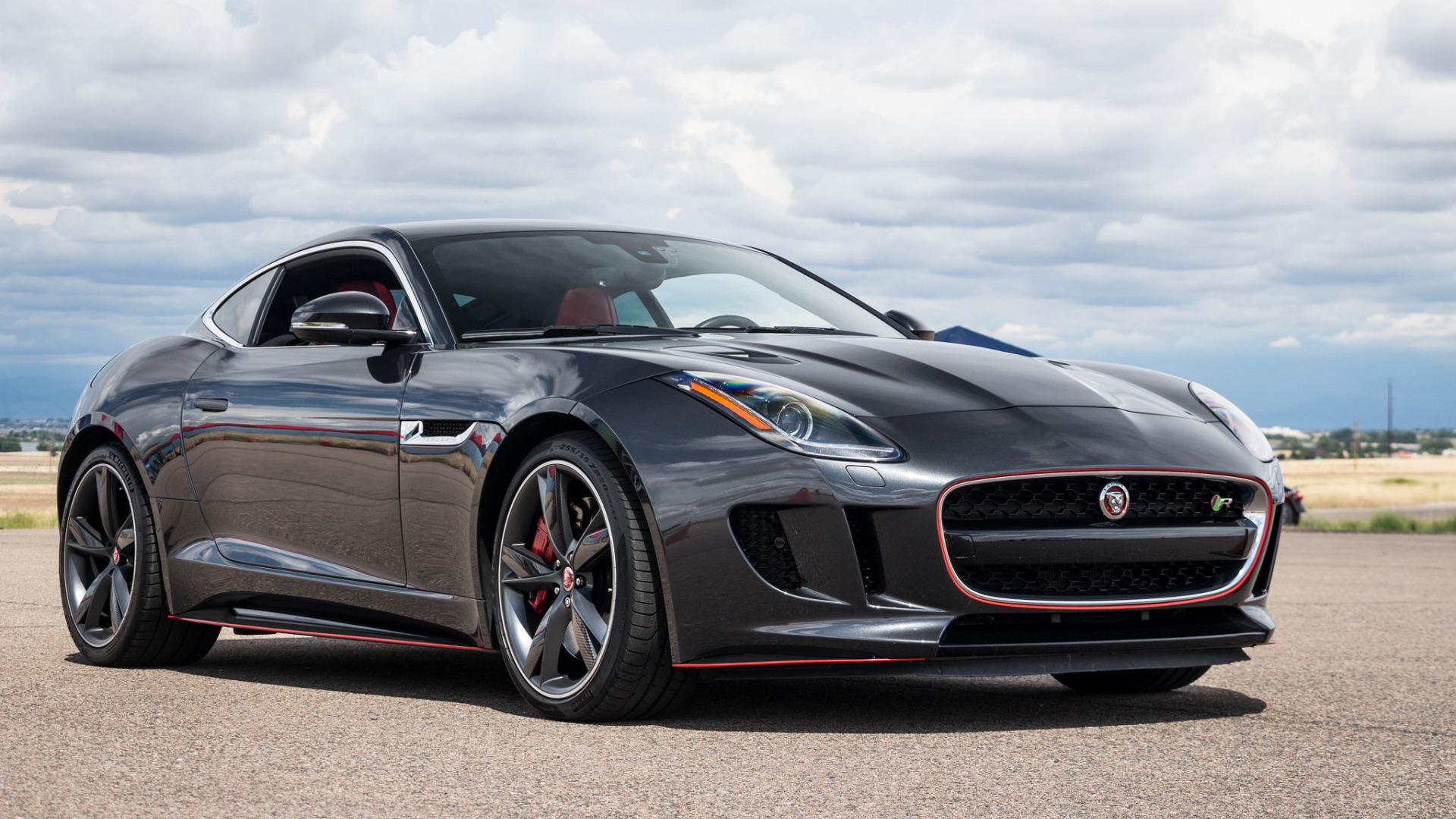 Description: A grey sports car parked on a road under a cloudy sky with clouds in the background and a red stripe on the front.