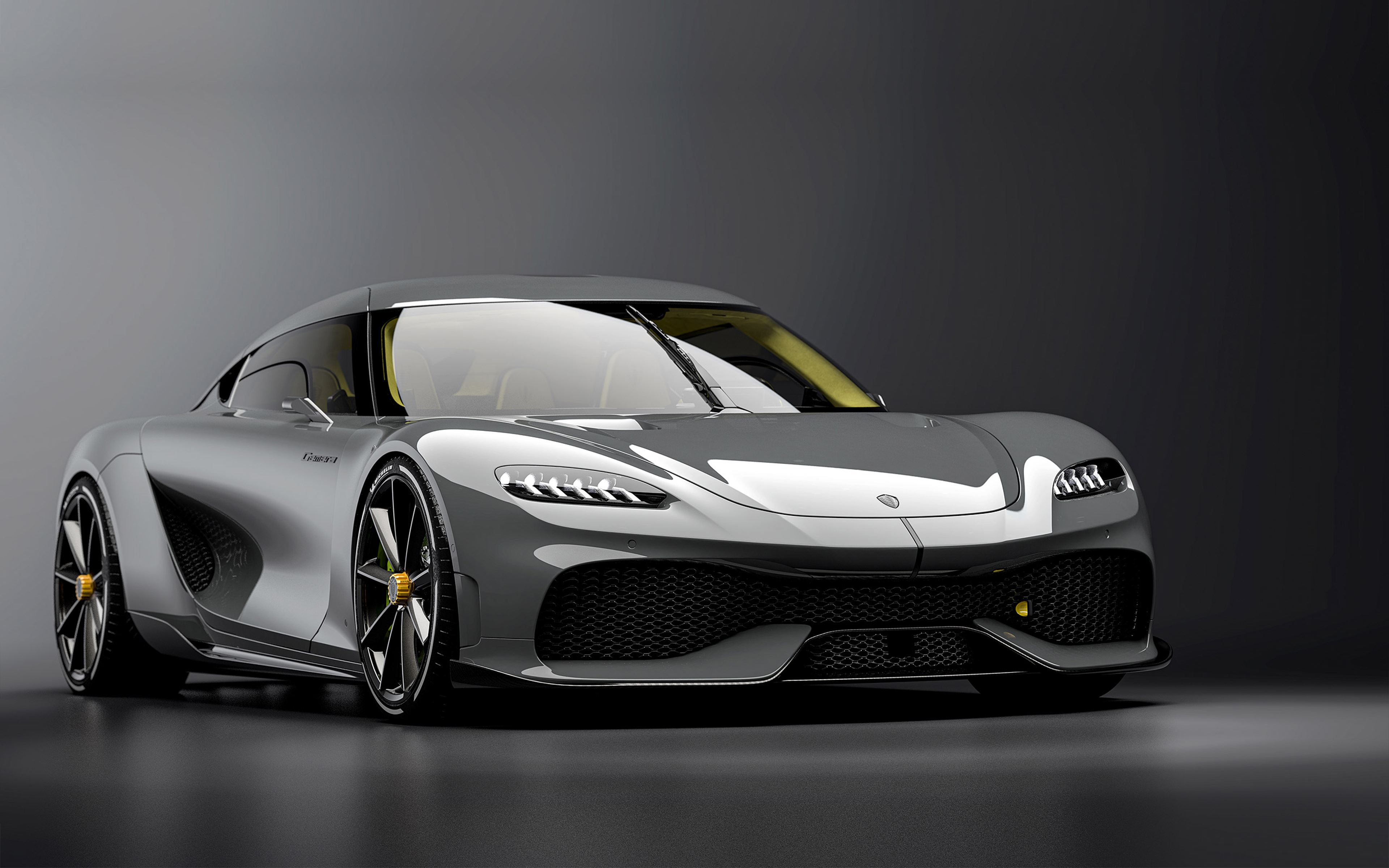 Description: A grey sports car with yellow accents on the hood and hood vents.