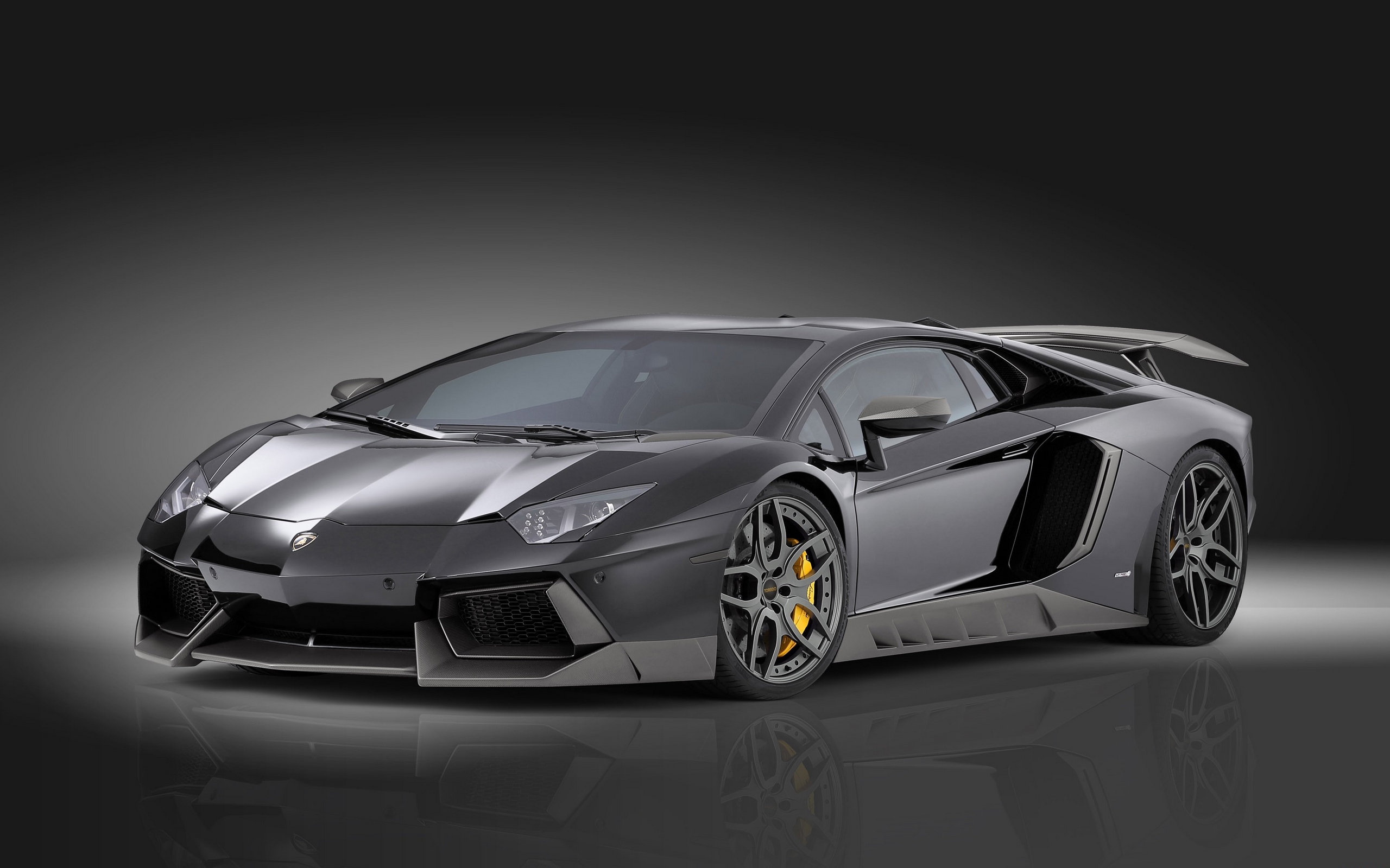 Description: A grey sports car with yellow wheels on a black background with a reflection of the car in the background.
