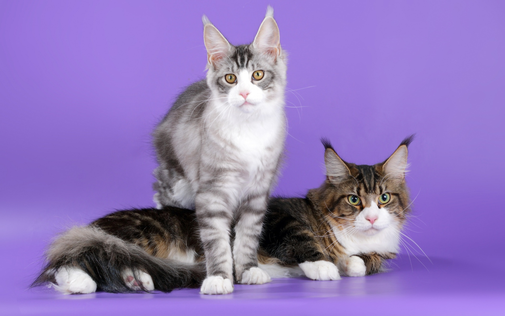 Description: Two cats sitting on a purple background with a purple background behind them.
