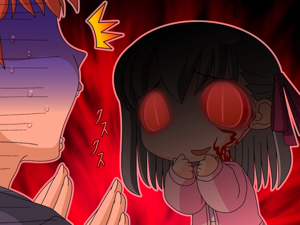 Description: A cartoon of a girl with blood on her face and a man with a knife in his mouth with blood on his face.