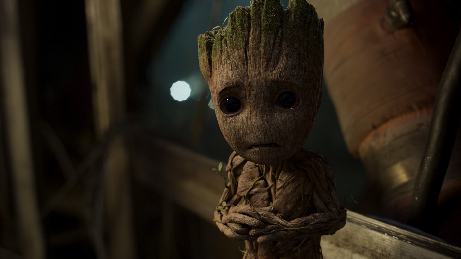 Description: A groote is standing in a room with a light in the background and a plant growing out of it.