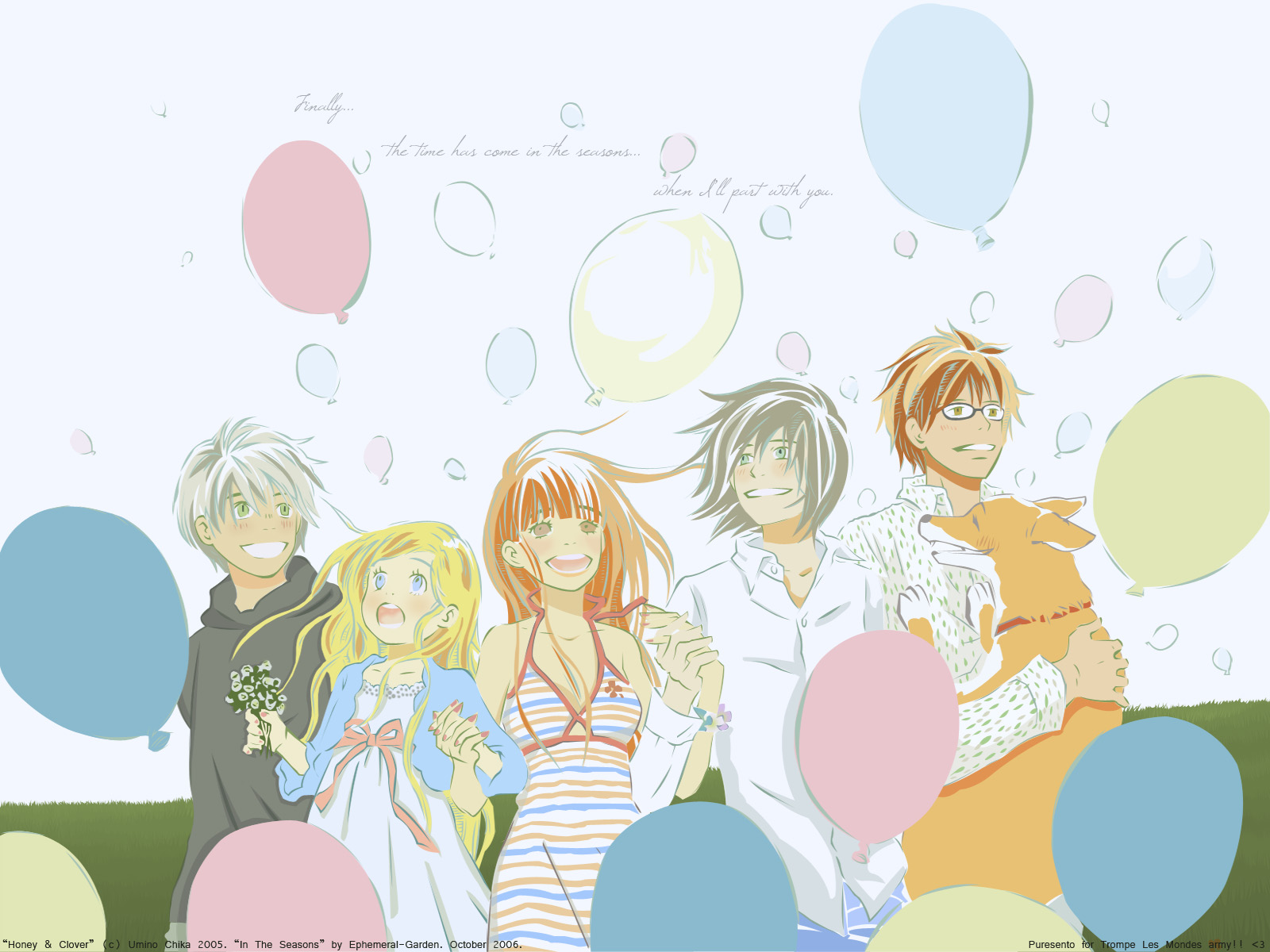 Description: A group of people standing next to each other with balloons in the air behind them and a dog on the ground.