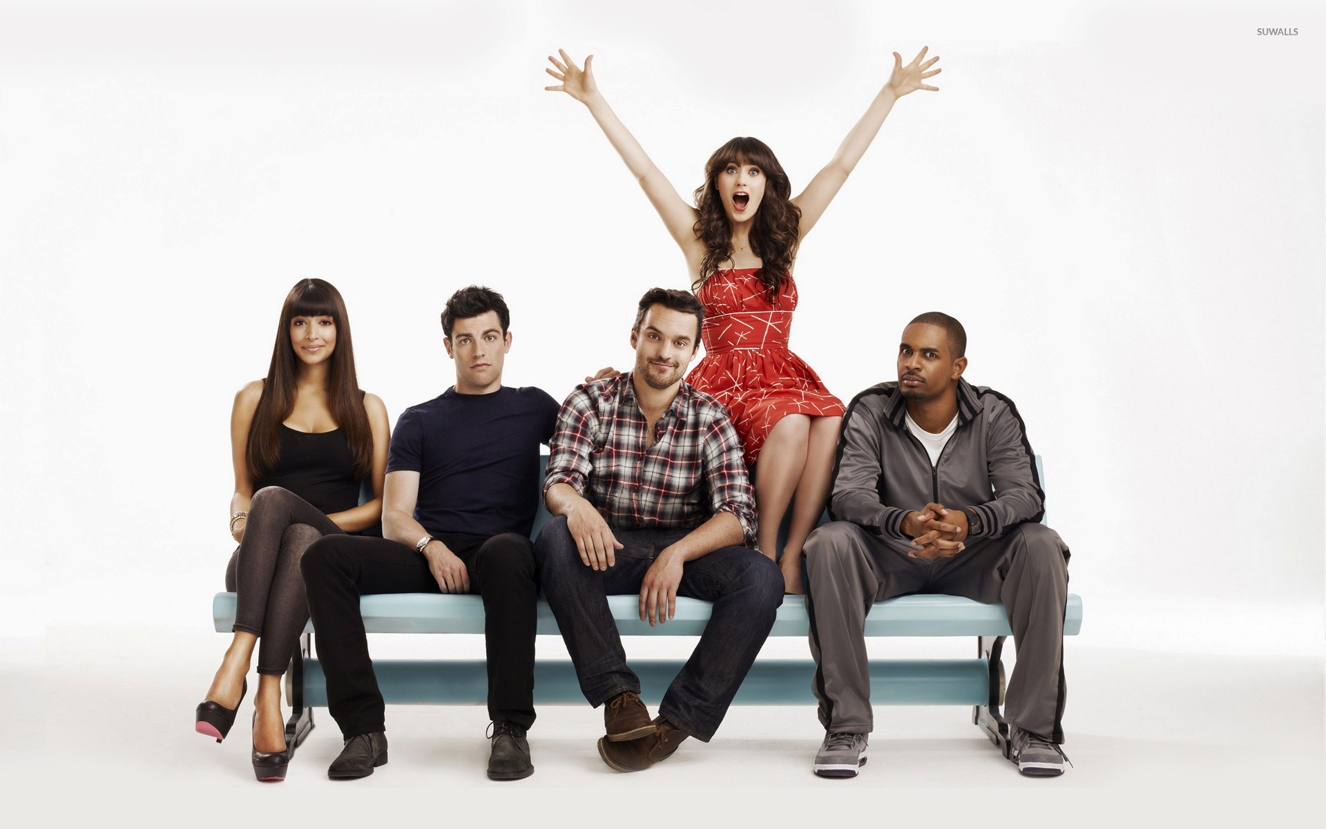 Description: A group of people sitting on a bench with their arms raised in the air and one person standing up.