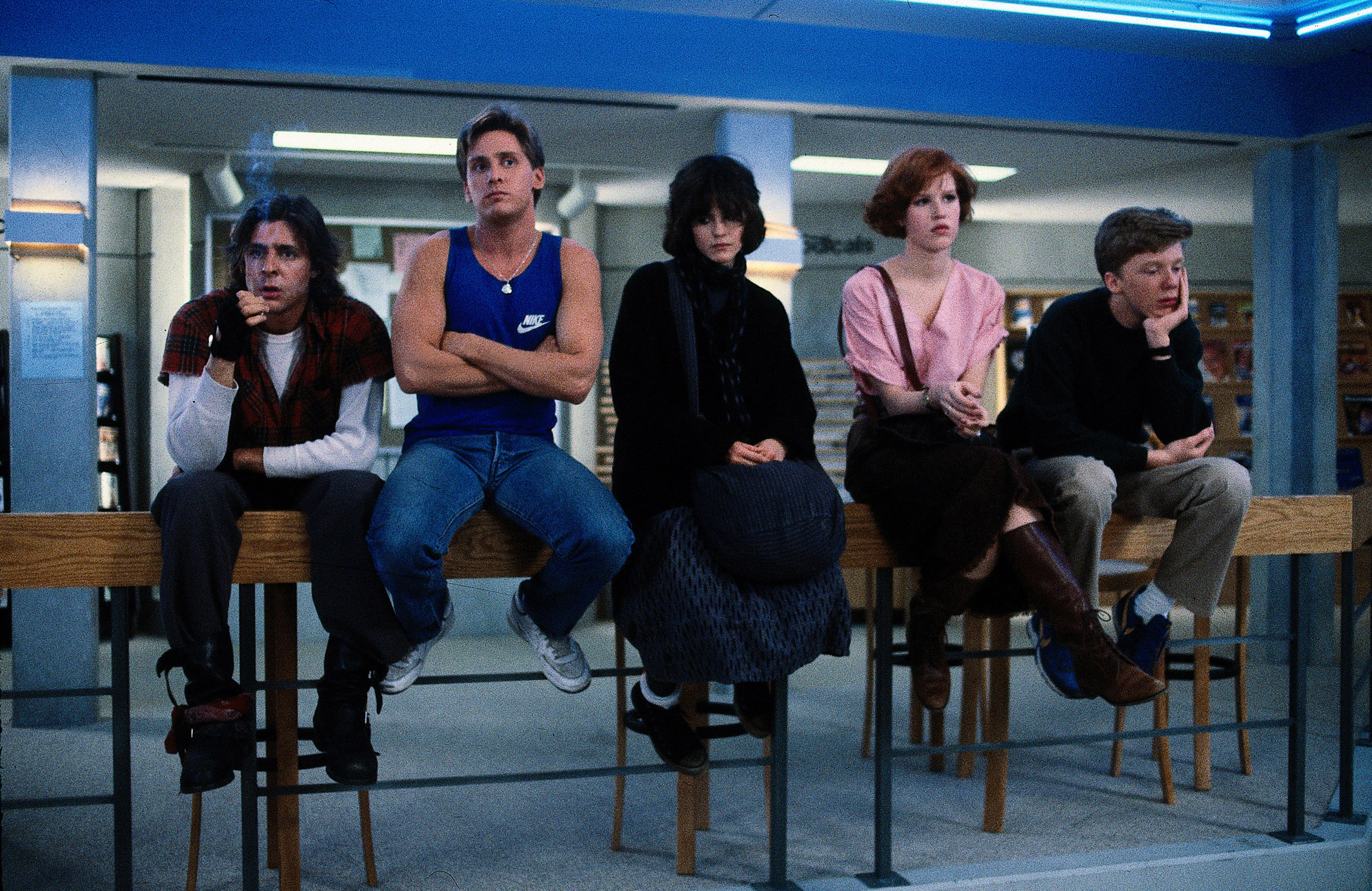 Description: A group of people sitting on top of a bench in a room with a blue ceiling and a blue wall.