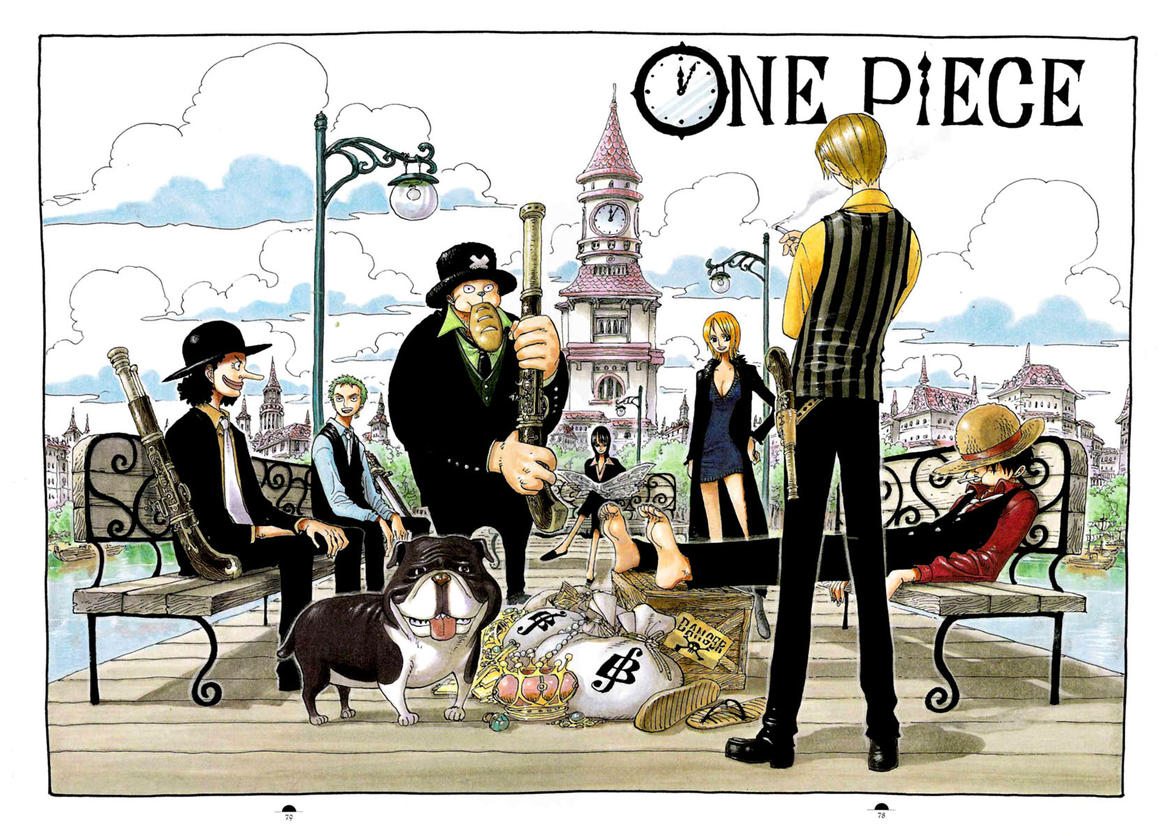 Description: A drawing of a group of people sitting on a bench with a dog in front of them and a clock tower in the background.