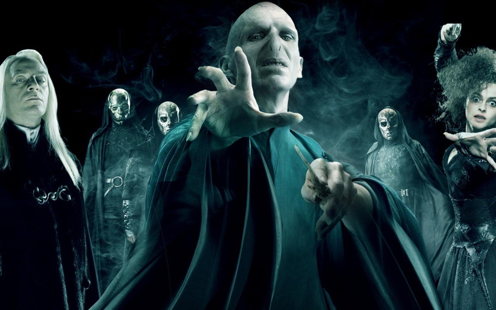 Description: A group of people dressed in black and white with a wizard costume on and a demon holding out his hand.