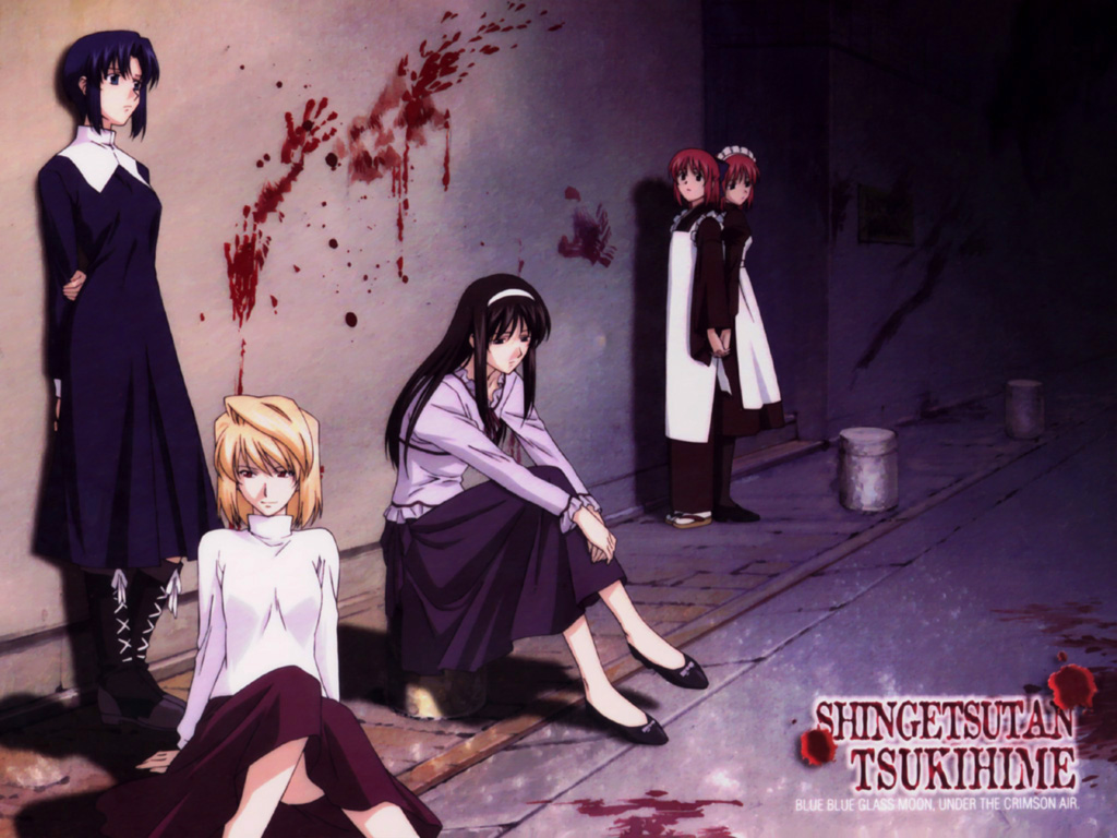 Description: A group of people sitting on the ground with blood on the wall behind them and a woman in a white shirt.