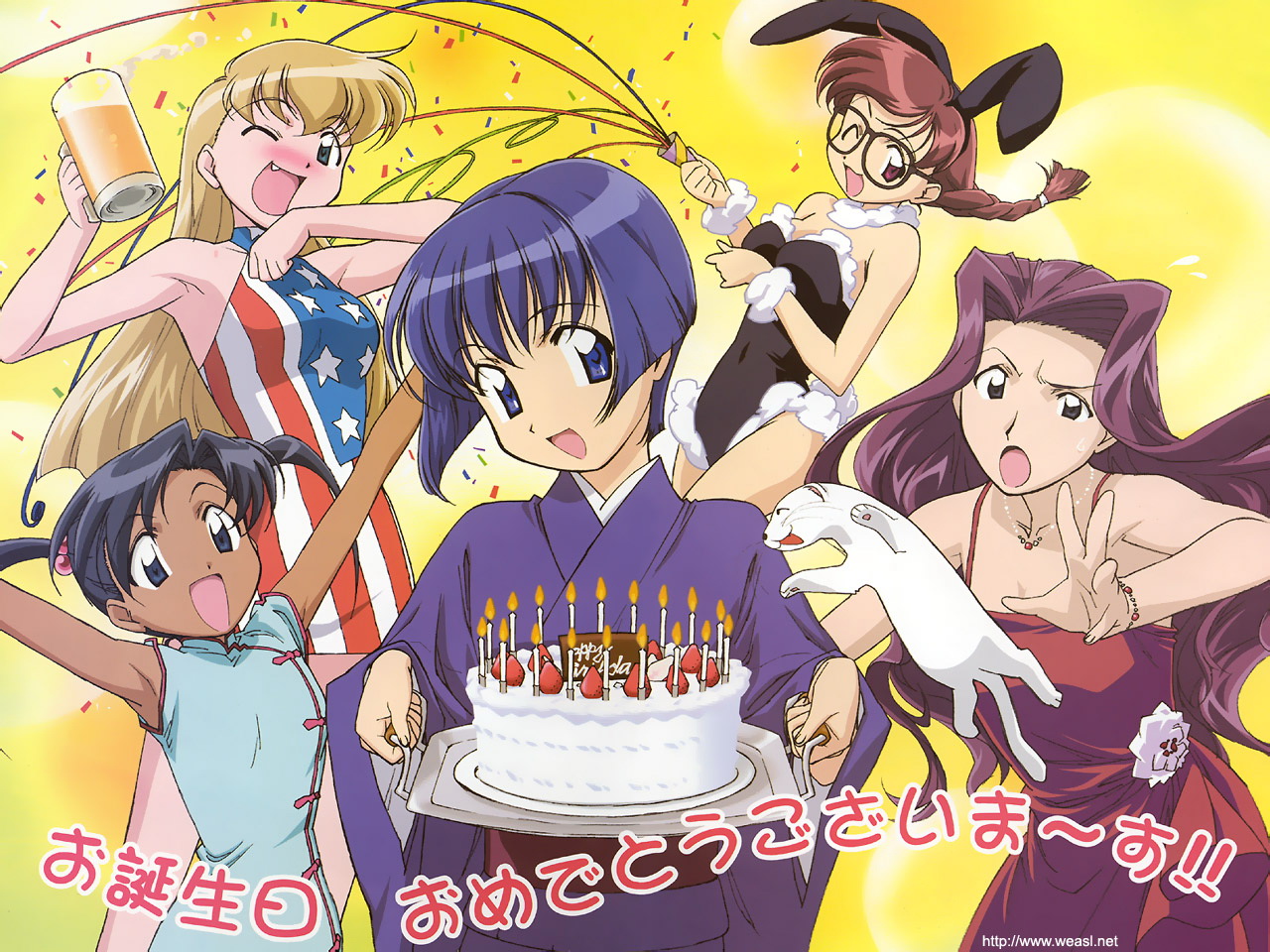 Description: A group of people standing around a cake with candles on it and a cat on top of it and a dog on the other side.