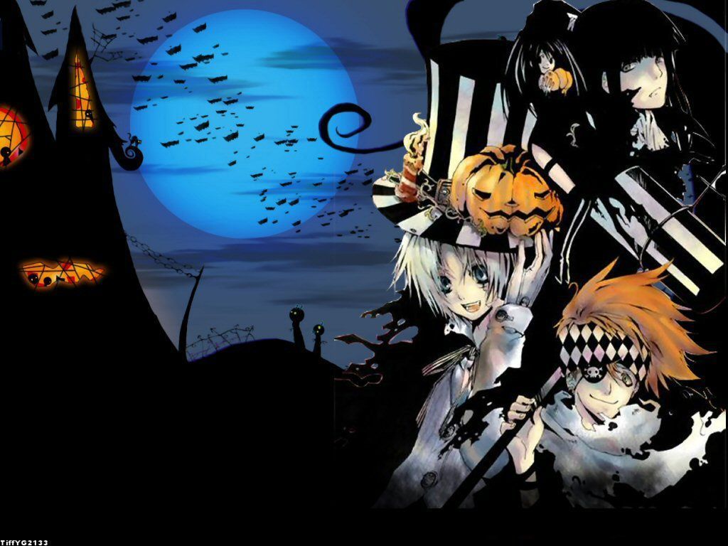 Description: A group of people standing in front of a castle with bats and pumpkins on it's face.