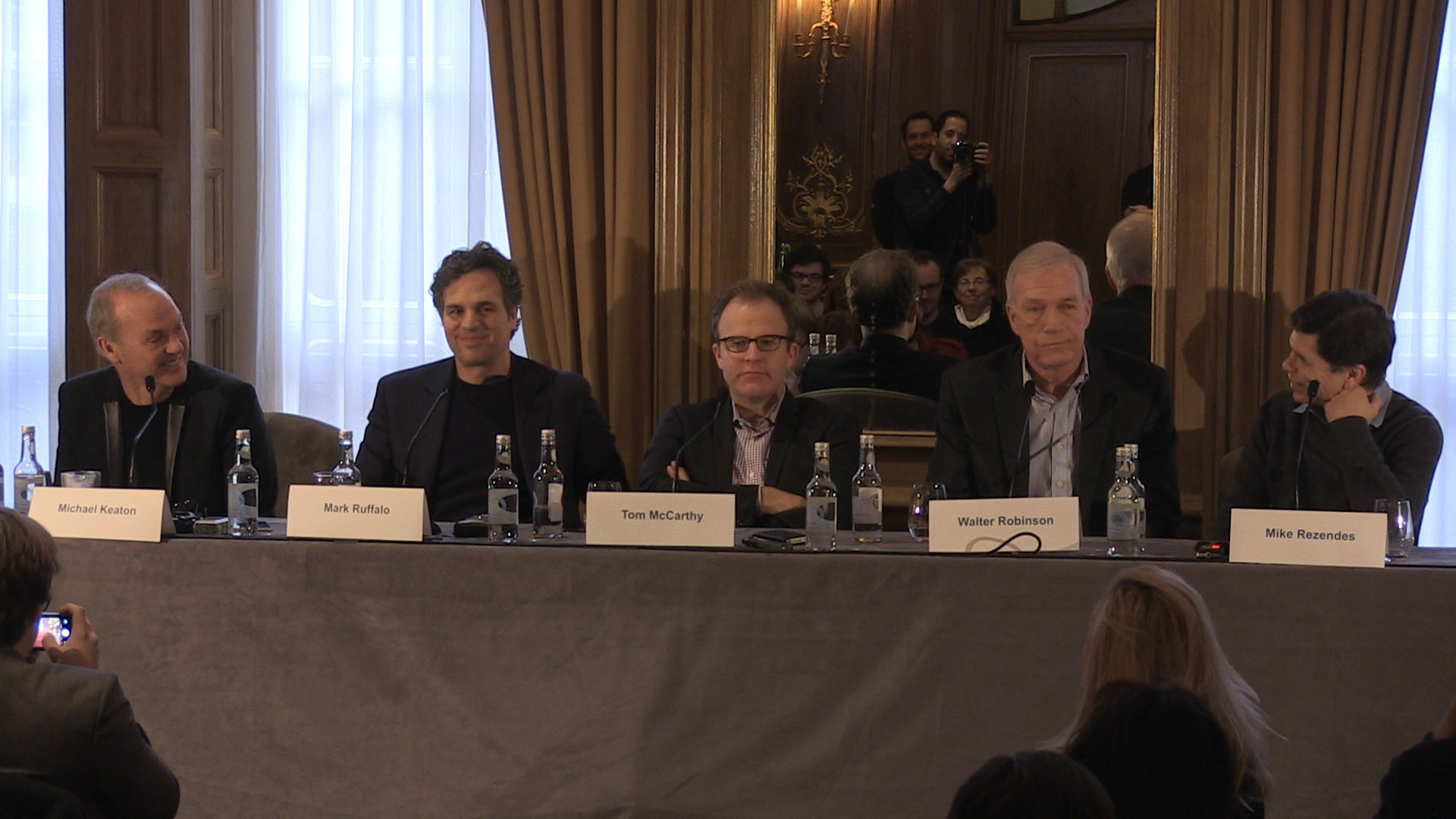 Description: A group of people sitting at a table with microphones in front of them and a camera in front of them.