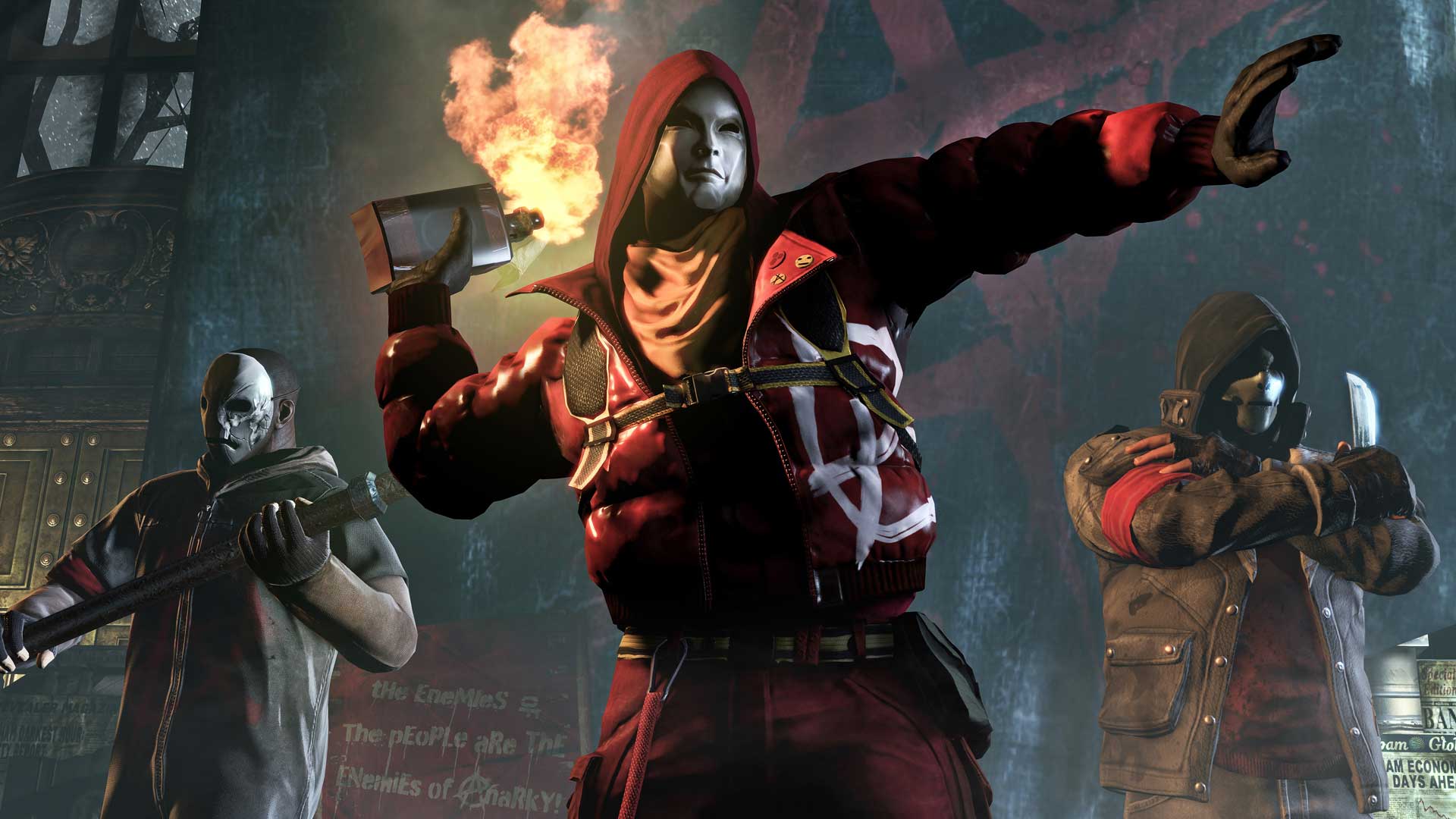 Description: A group of people in a dark room with a fire in the middle of the room and a man holding a gun.