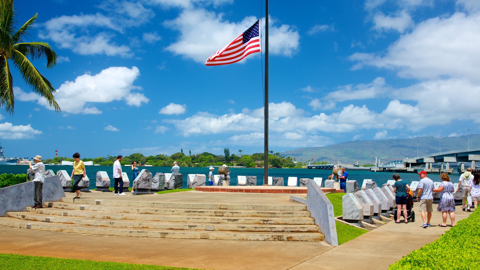 Description: A group of people standing around a flag pole near a body of water with a flag flying in the background.