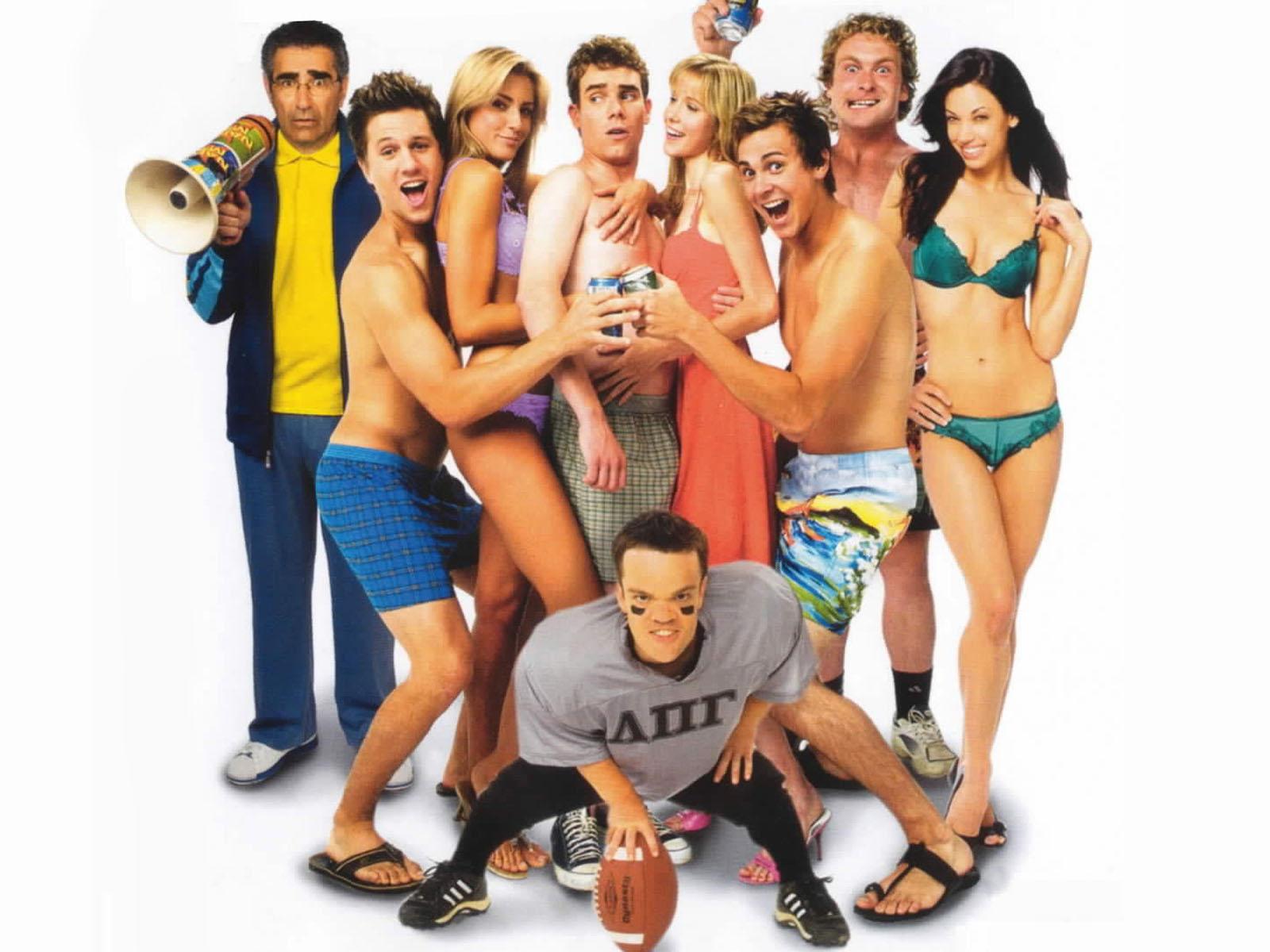 Description: A group of people posing for a picture together with a football and a man in a bathing suit holding a megaphone.
