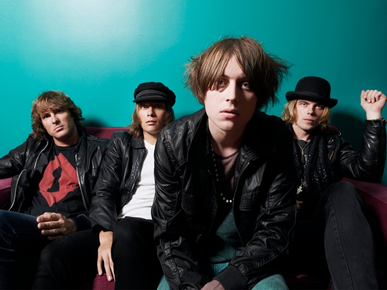 Description: A group of men sitting on top of a couch next to each other in a room with a blue wall.