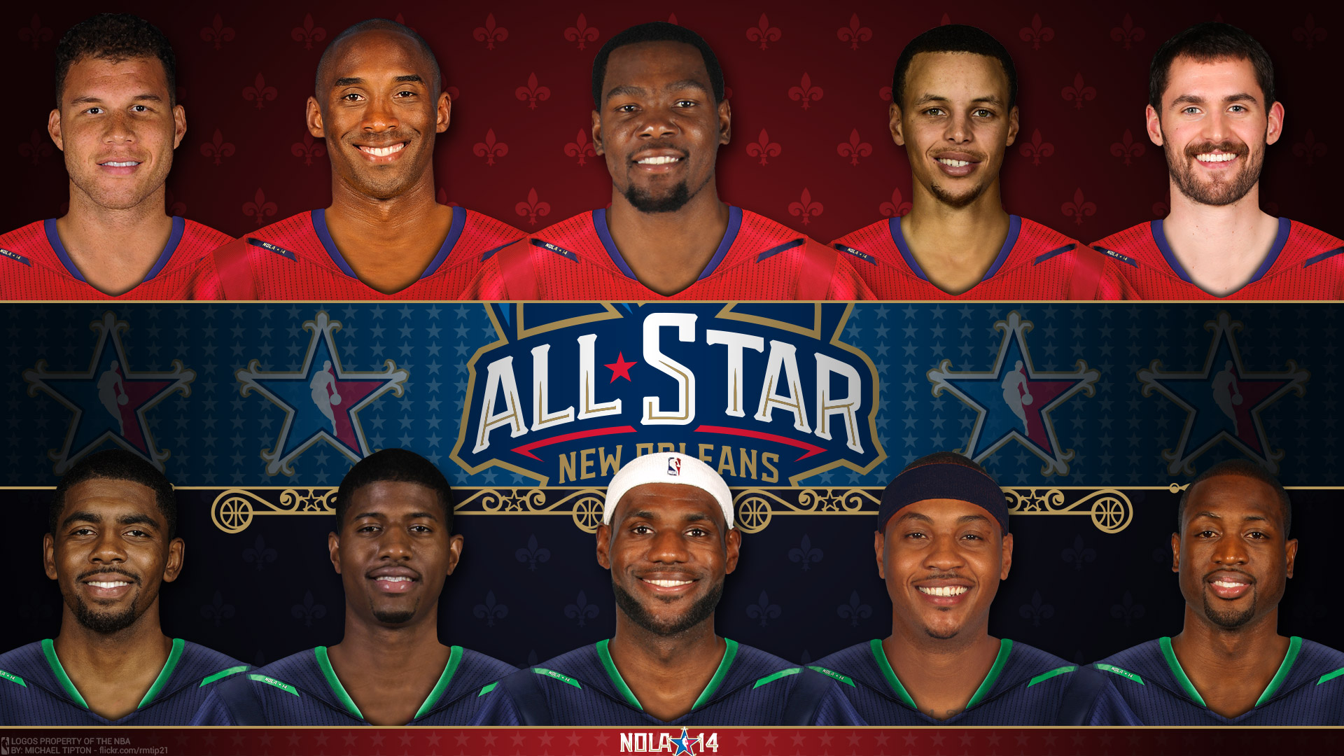Description: A group of men standing next to each other in front of a red background with all star logos on it.